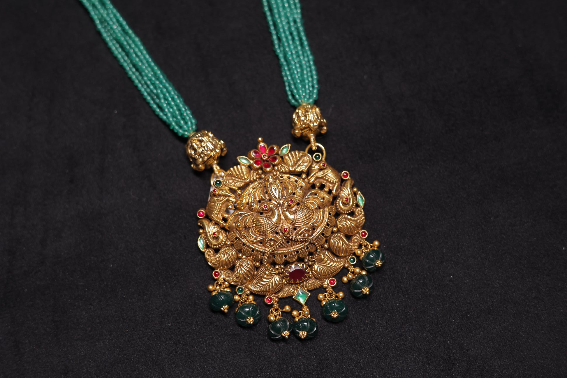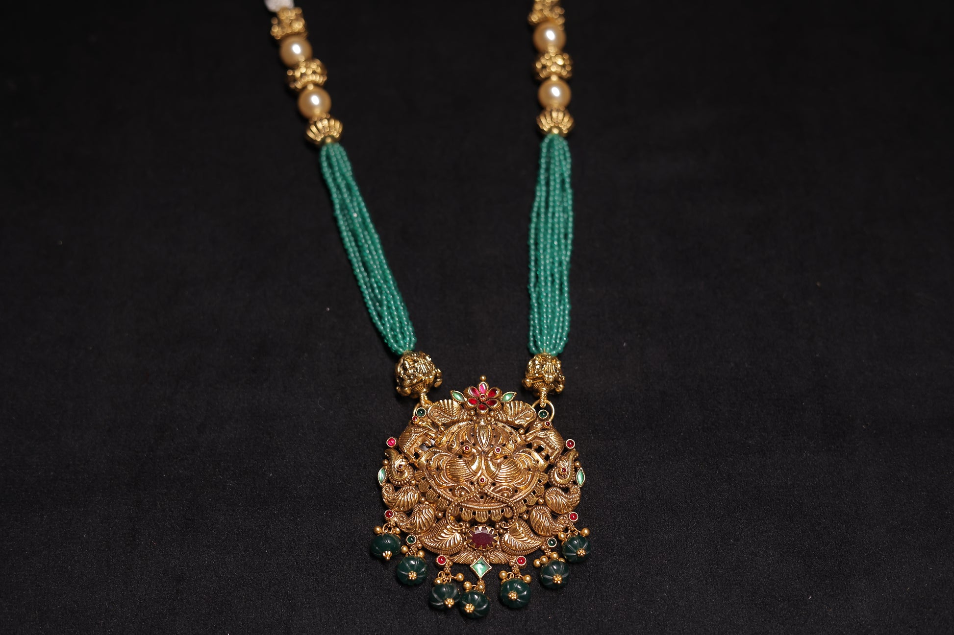 A captivating multi-layered necklace featuring a graceful combination of pearl and green bead strands, adorned with ornate gold detailing. The intricately designed temple-style pendant showcases divine motifs, floral engravings, and a central idol, symbolizing spirituality and heritage. Accentuated with red gemstones, pearls, and delicate green bead drops, this exquisite piece reflects timeless craftsmanship, making it an ideal choice for traditional and bridal ensembles.