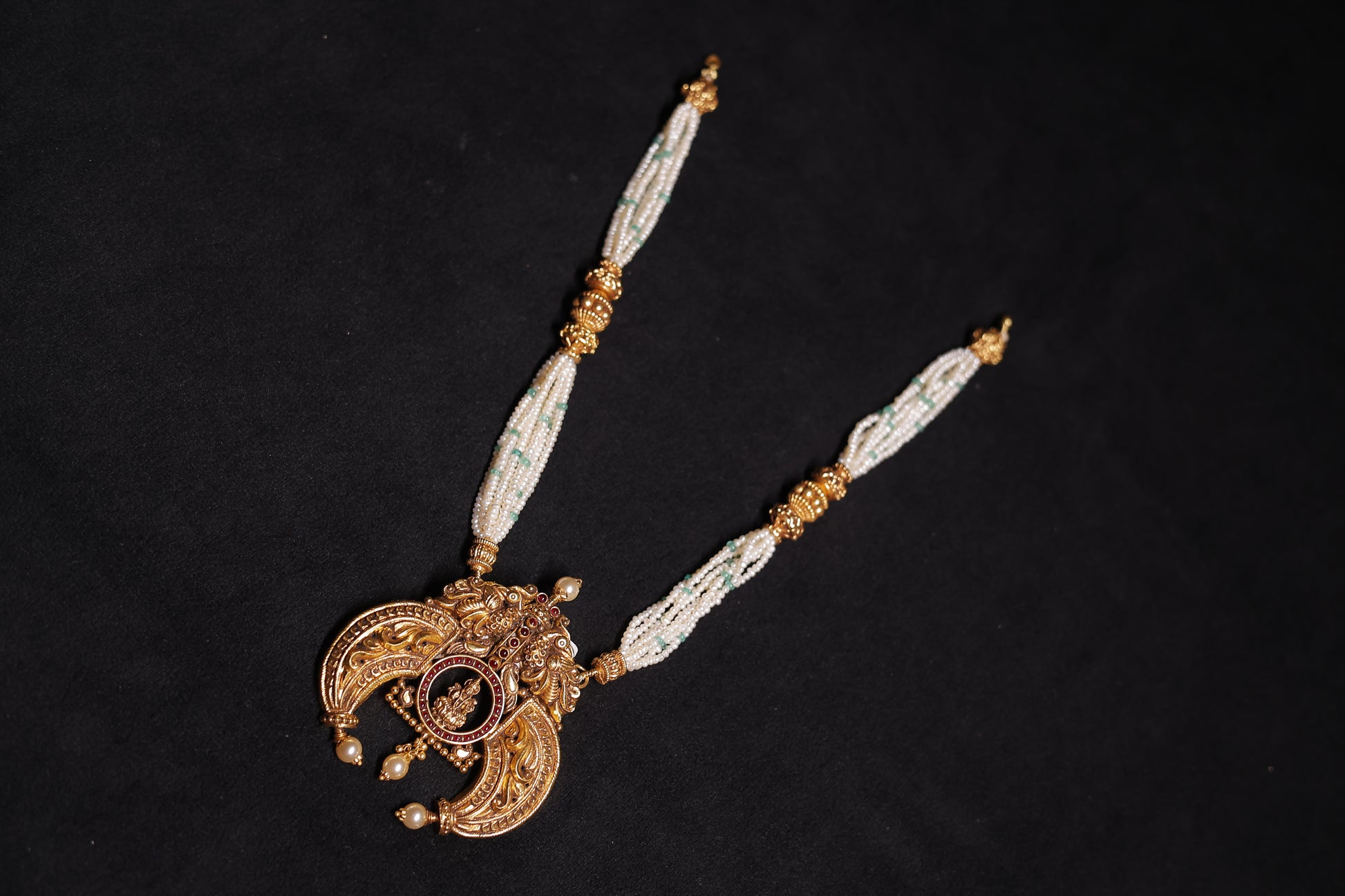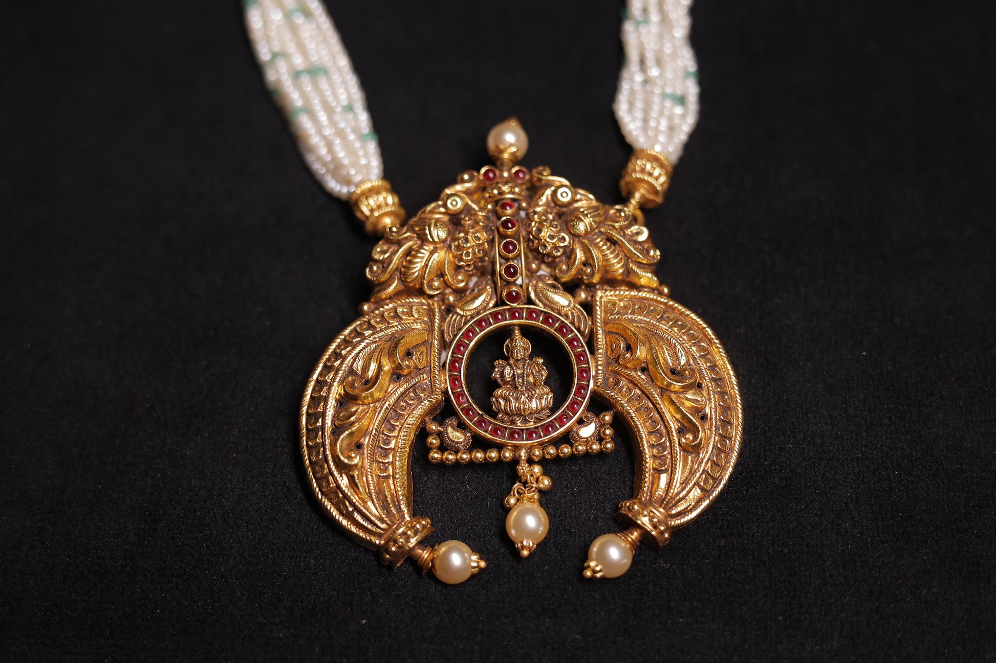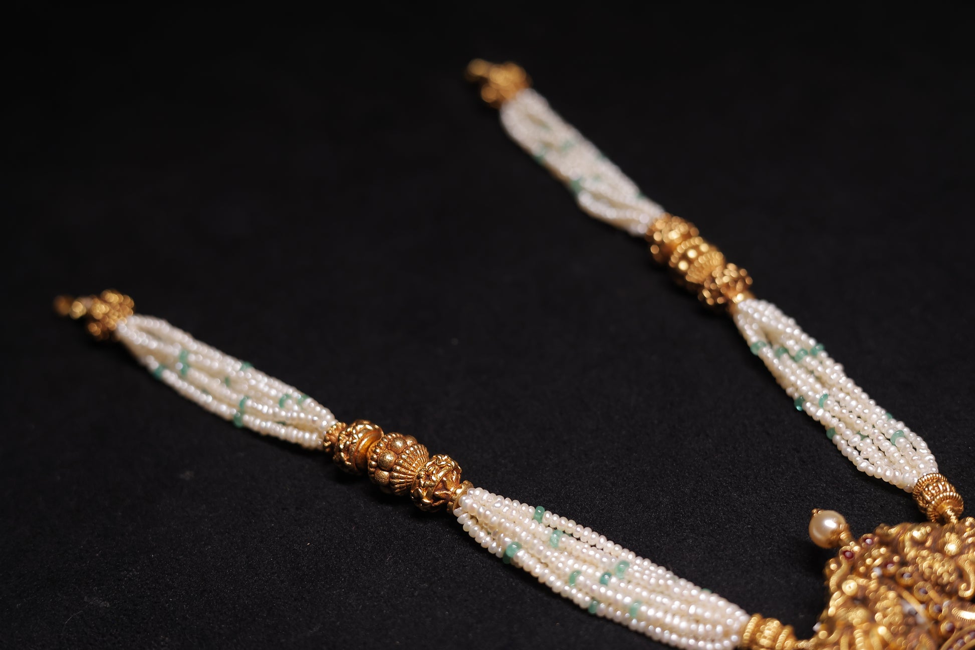 A majestic multi-layered pearl mala adorned with a grand gold pendant, inspired by temple jewelry. The intricately carved pendant showcases divine motifs with floral engravings and a central idol, symbolizing spirituality and grace. Embellished with red gemstones, pearls, and exquisite gold detailing, this statement piece embodies heritage craftsmanship, making it a perfect choice for traditional and bridal ensembles.