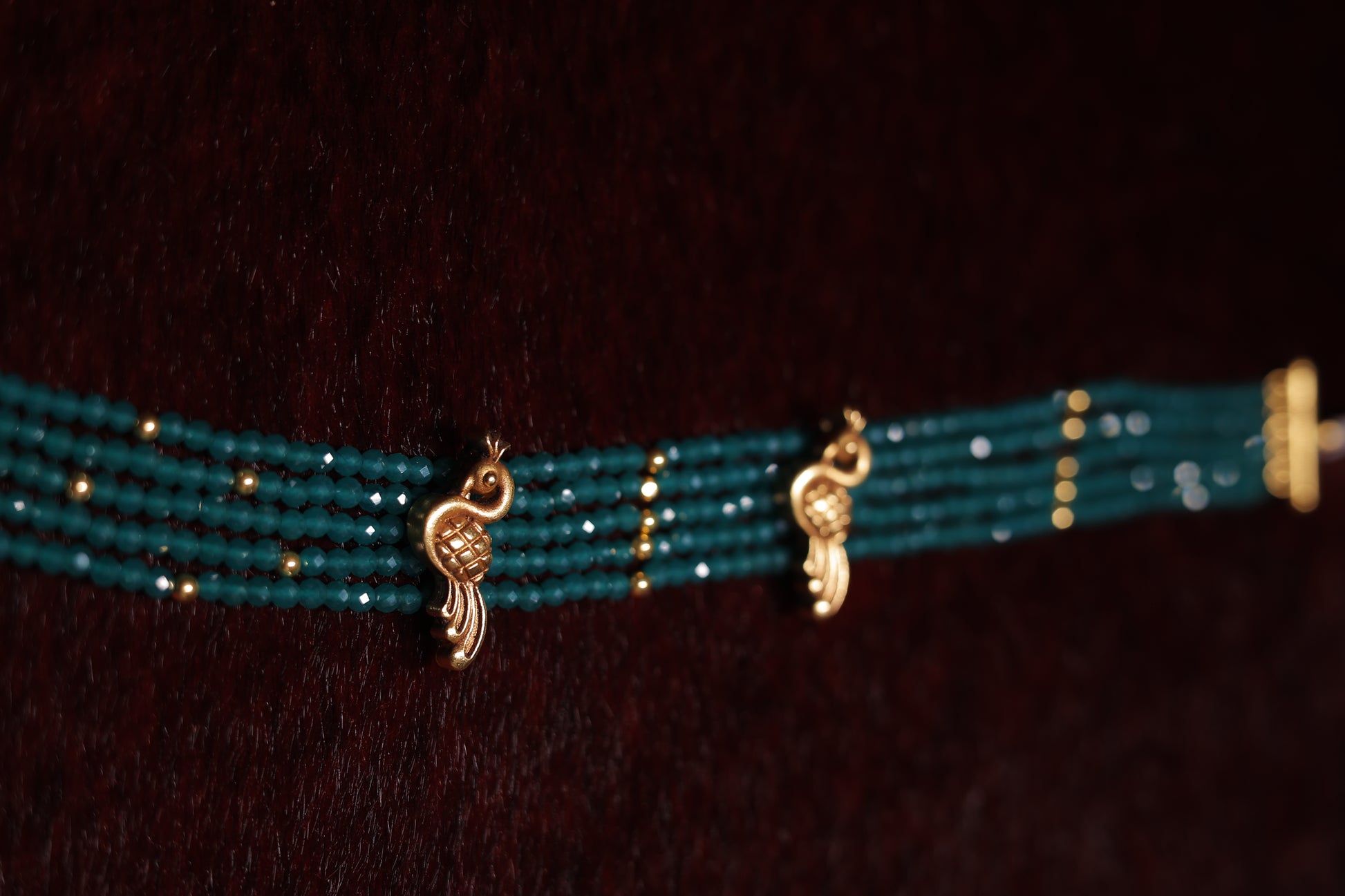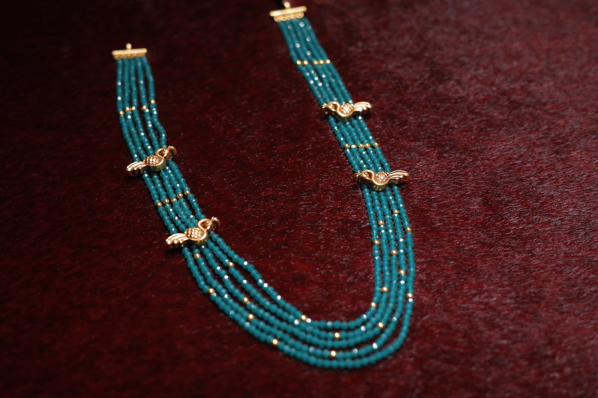 A stunning multi-layered necklace adorned with deep green beads, exuding a regal and timeless charm. The intricate gold accents interwoven throughout the strands add a touch of sophistication, while the delicate gold motifs enhance its grandeur. Perfect for both traditional and contemporary ensembles, this necklace is a statement of elegance and heritage craftsmanship.