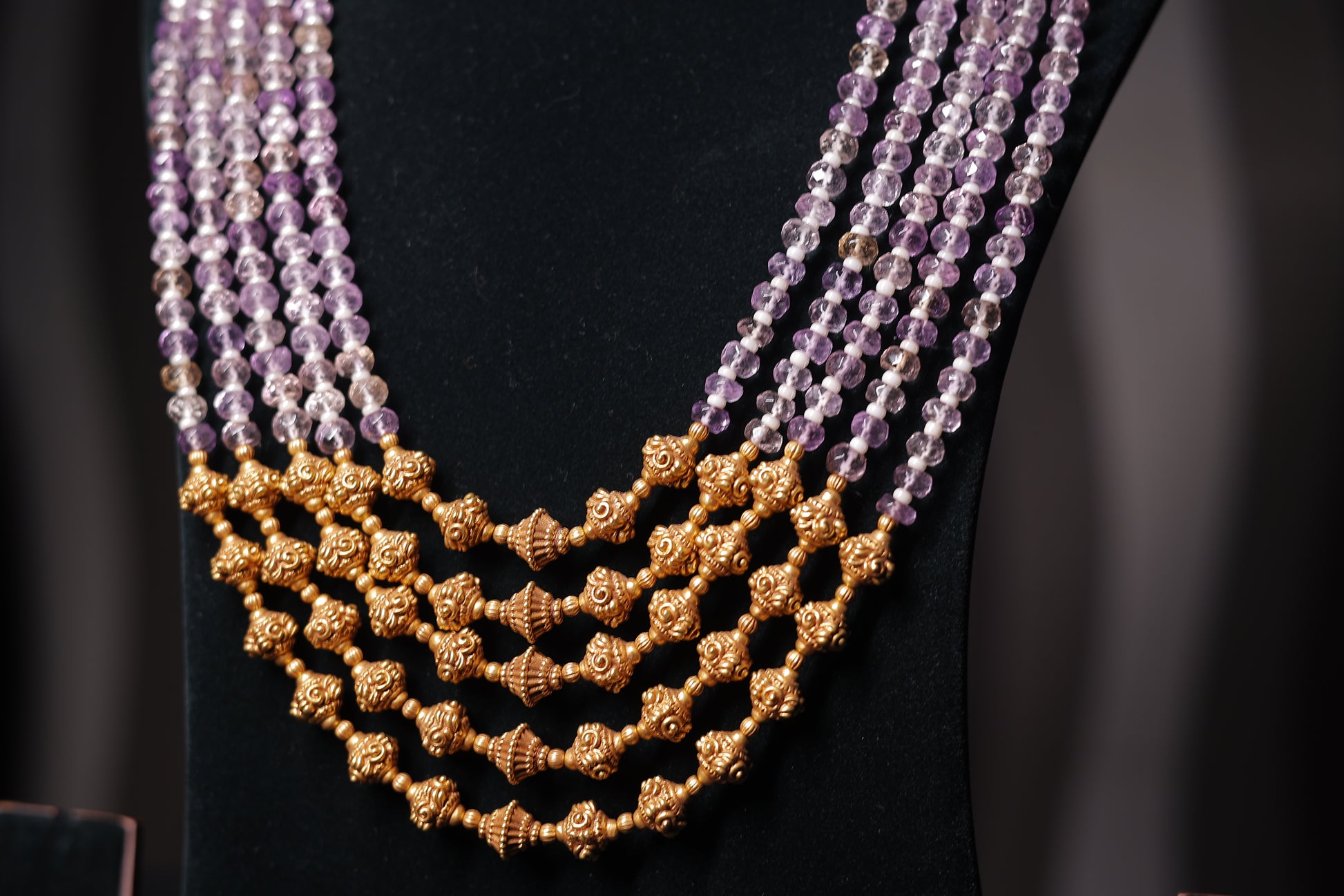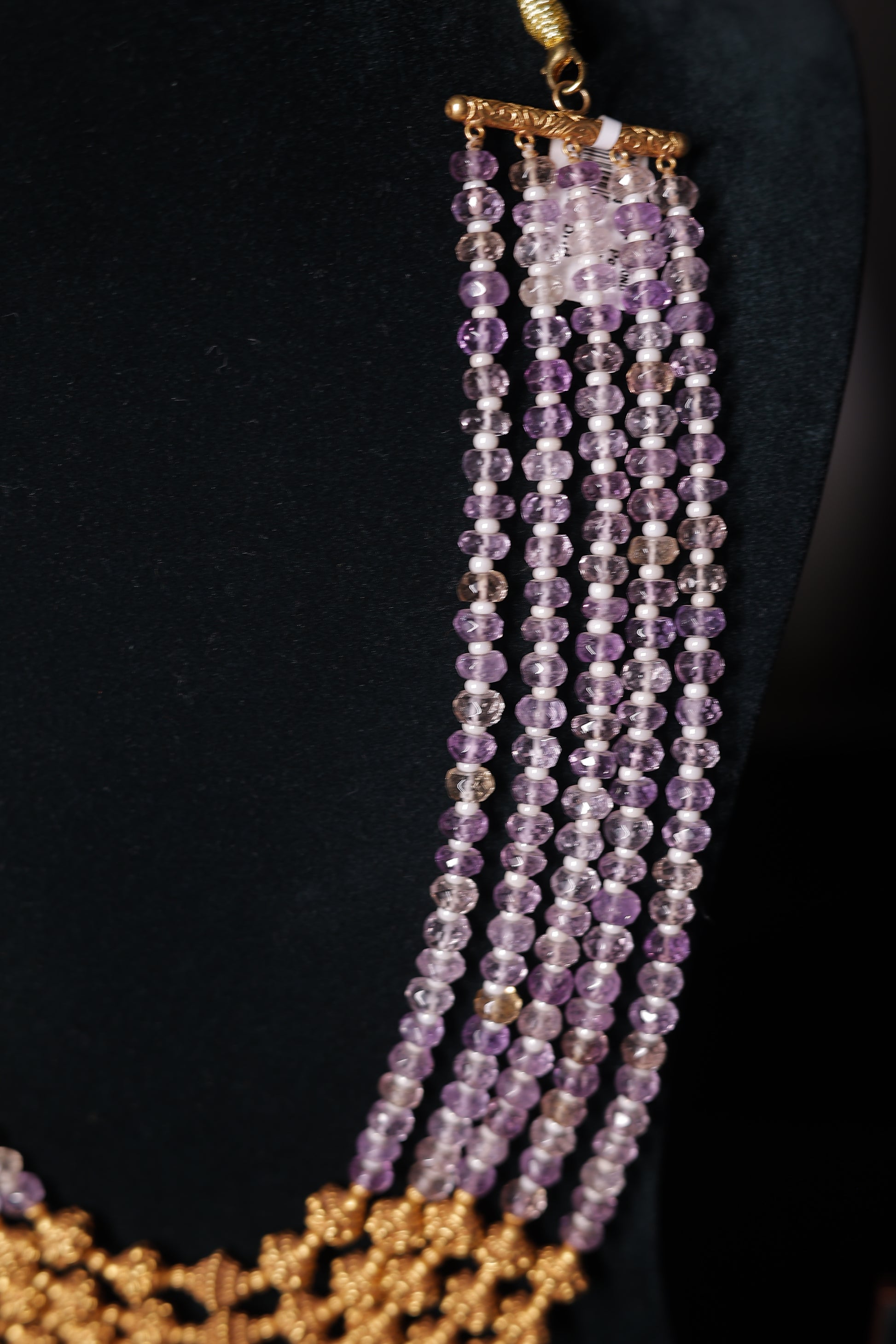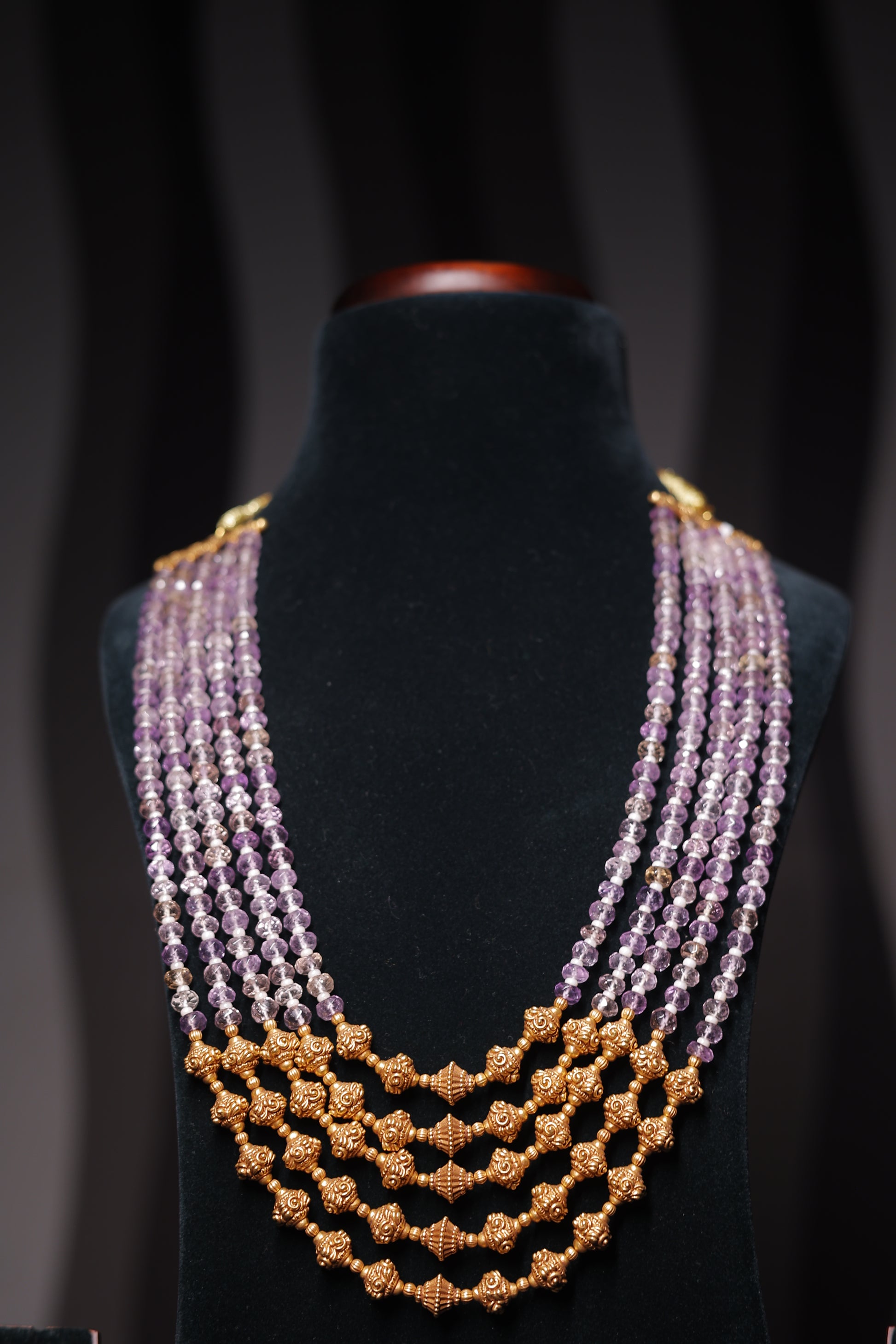 A stunning five-layered necklace that exudes grace and royalty. The delicate light purple beads at the ends add a touch of softness, while the intricately designed gold and cricket ball-shaped elements enhance its opulence. This masterpiece seamlessly blends tradition with contemporary elegance, making it a timeless adornment.