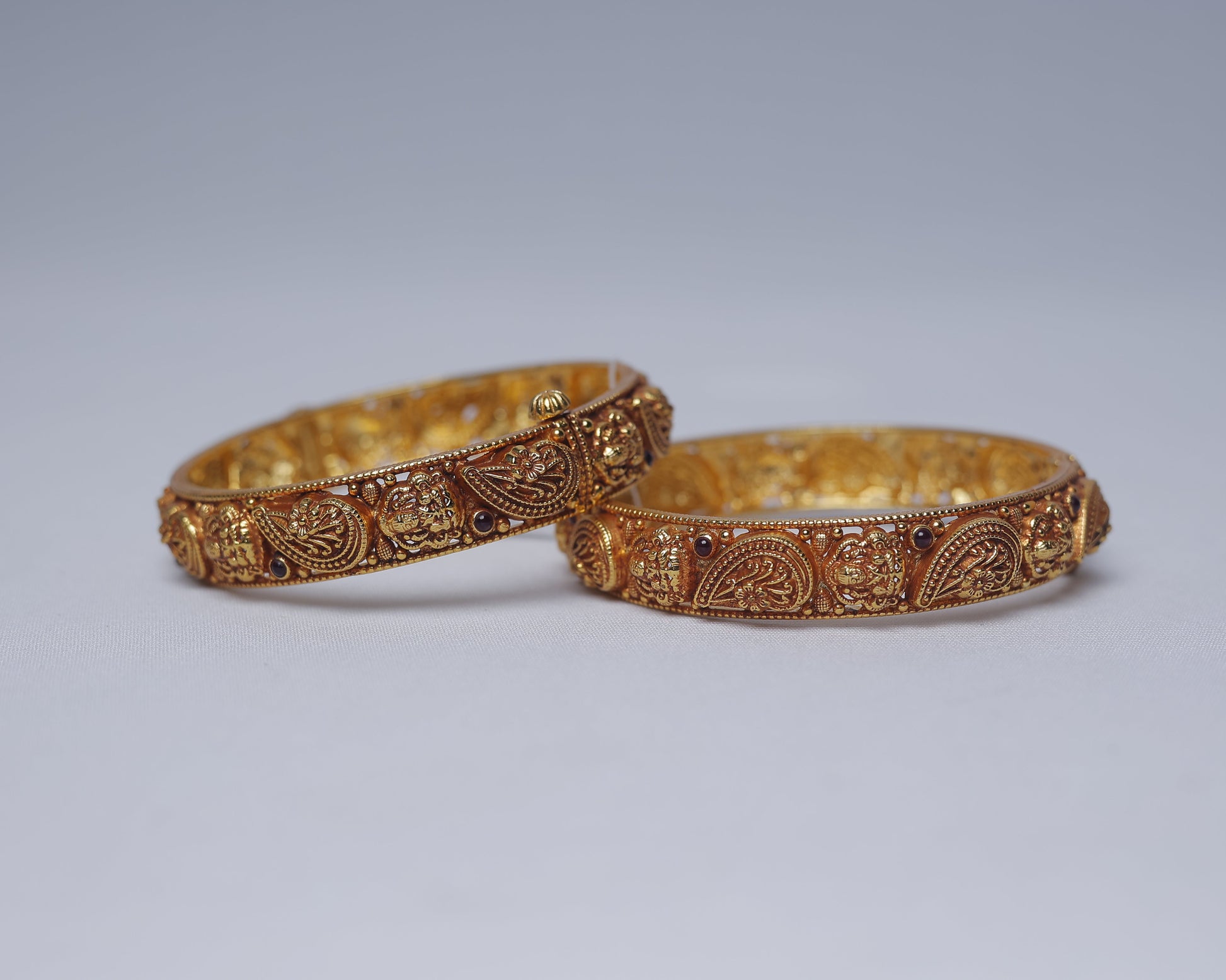 These stunning silver bangles, polished with rich gold, feature an intricate design adorned with subtle red-studded stones. While carrying hints of temple-inspired motifs, they maintain a balanced elegance, making them versatile for grand celebrations. The fine craftsmanship and detailed patterns add a regal charm, making them the perfect accessory for festive and traditional occasions. Their timeless appeal and luxurious finish ensure they stand out beautifully in any ensemble.