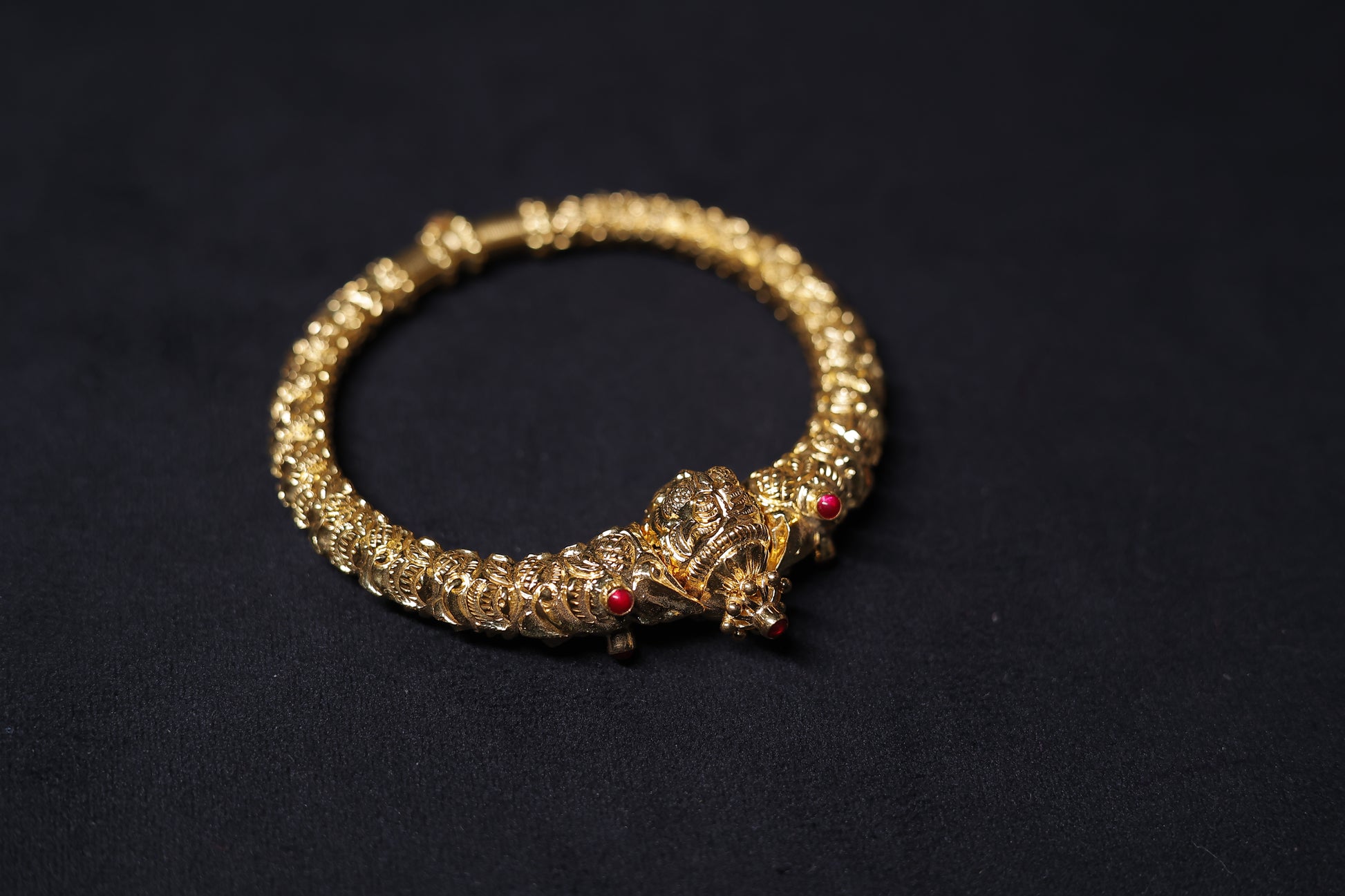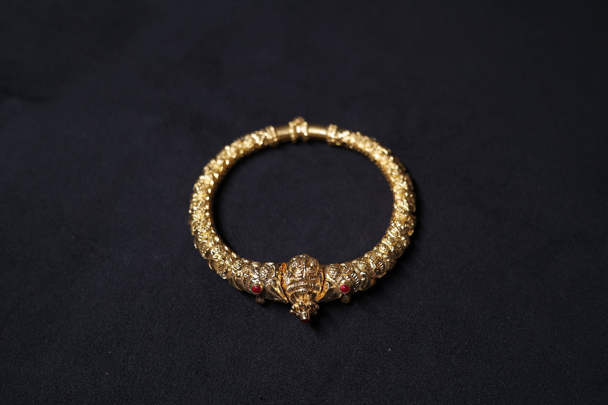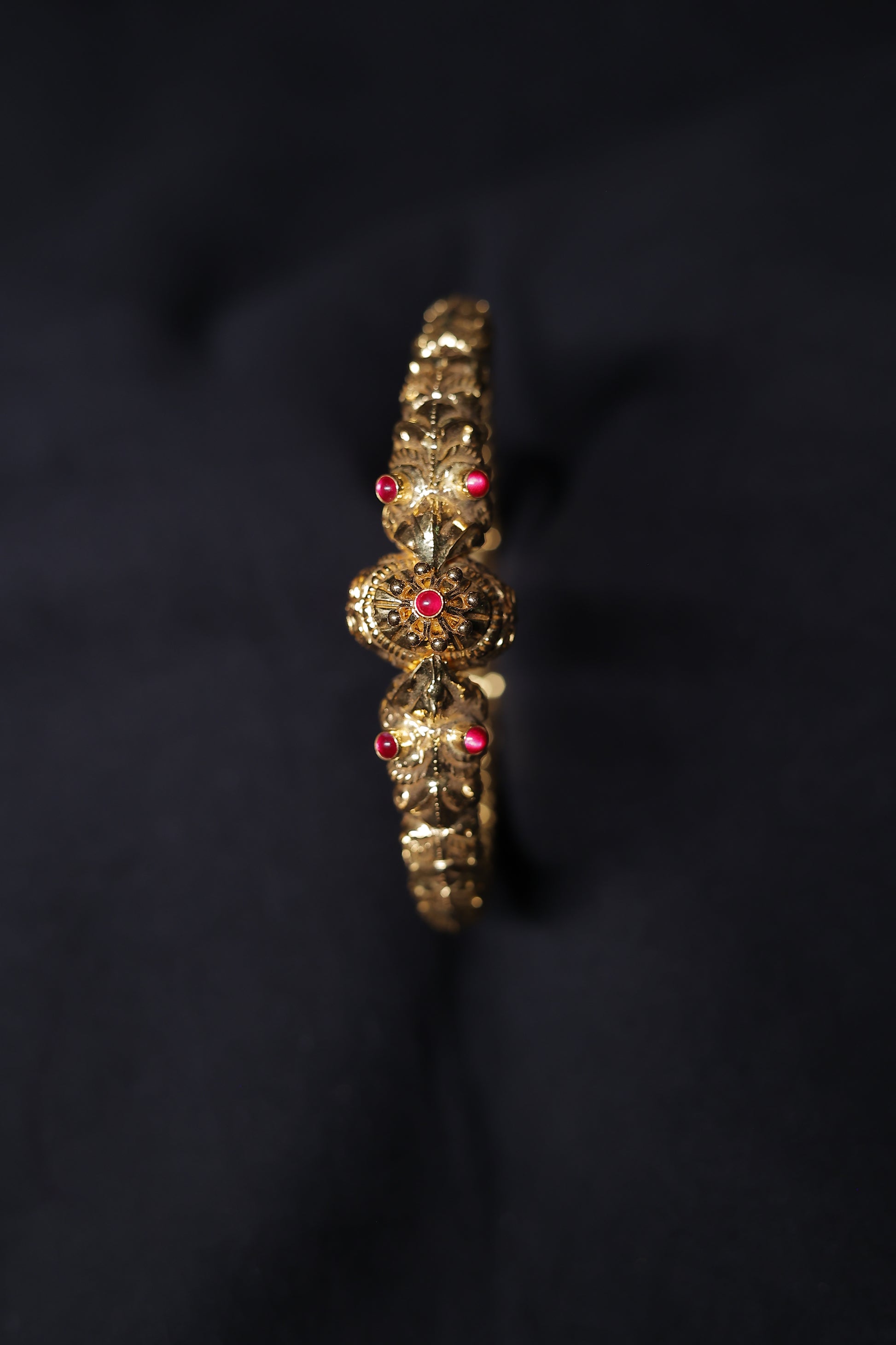 A true masterpiece of artistry, this intricately designed gold Kada exudes elegance and tradition. Crafted with exquisite detailing, its rich patterns reflect timeless craftsmanship. Subtle yet striking, the few carefully placed red-studded stones add a touch of vibrancy without overpowering its regal charm. Perfect for those who appreciate fine jewellery with a balance of grandeur and grace.