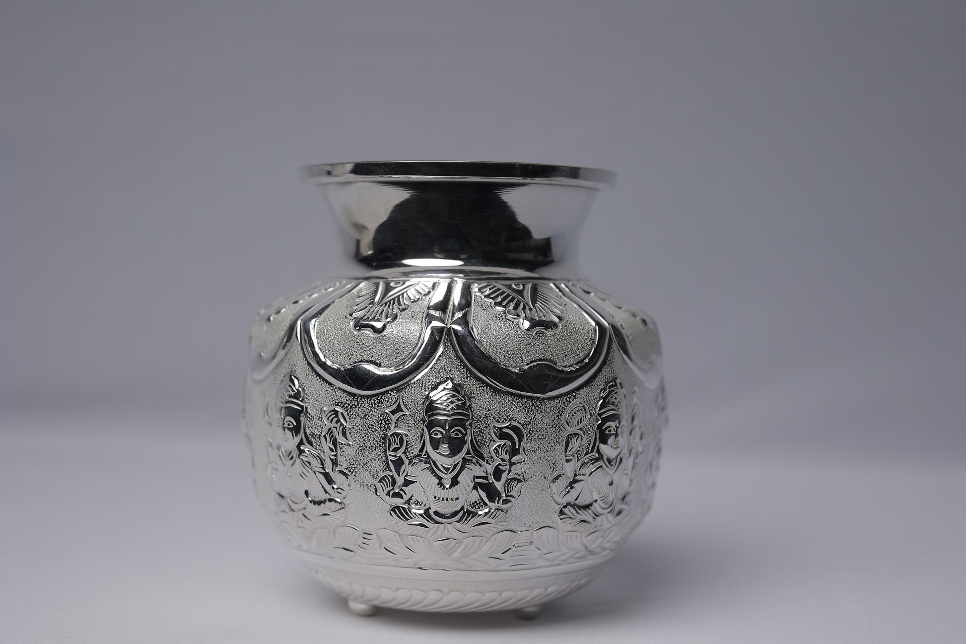 This magnificent silver Kalash is adorned with finely detailed goddess engravings, radiating divine grace and spiritual significance. Each intricate carving symbolizes blessings, abundance, and protection, making it a sacred treasure for rituals and auspicious occasions. The expert craftsmanship brings out the depth of every motif, creating a piece that is both artistic and devotional. With its exquisite detailing and traditional charm, this Kalash stands as a timeless symbol of faith and prosperity.
