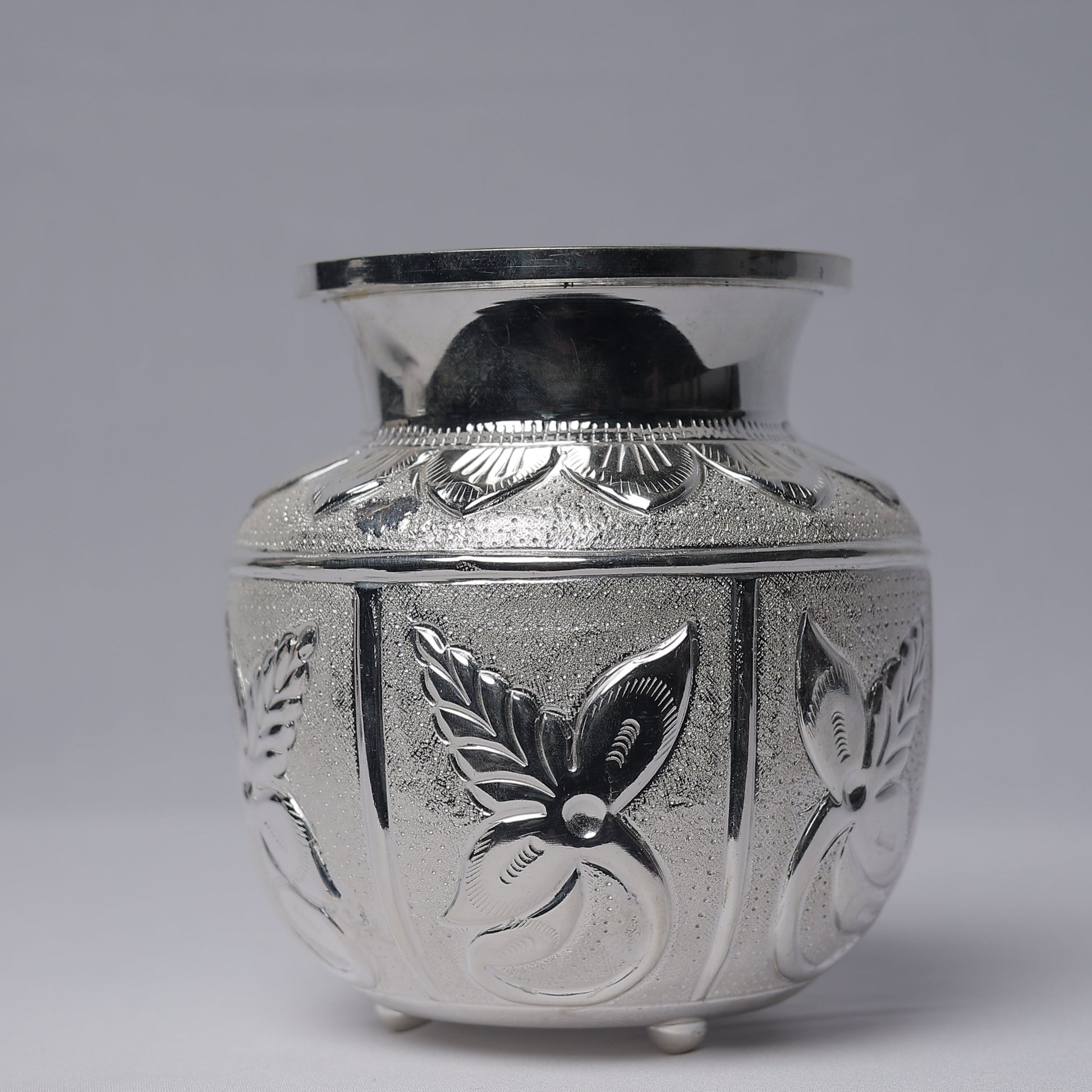 This exquisite silver Kalash features intricate leaf-inspired motifs along with other beautifully detailed patterns, adding to its divine elegance. The finely crafted designs enhance its traditional charm, making it a perfect addition to sacred rituals and ceremonies. Its meticulous artistry and graceful structure reflect purity, prosperity, and cultural heritage, making it a timeless piece for spiritual occasions.
