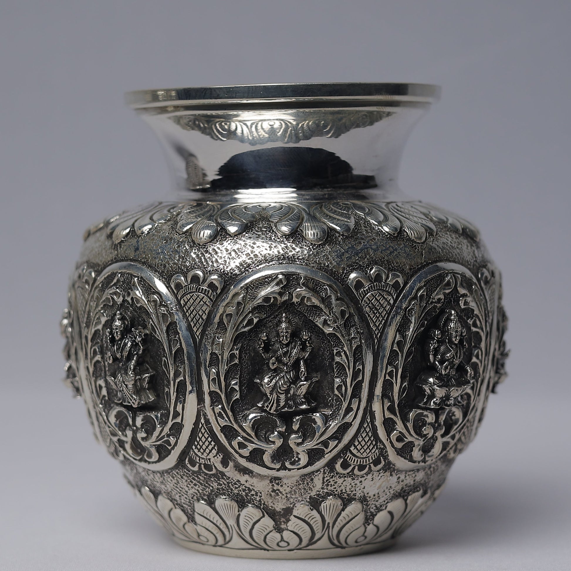 This exquisite silver Kalash is intricately designed with exceptional detailing, featuring Goddess Lakshmi at its center, symbolizing wealth and prosperity. The entire structure is adorned with delicate patterns, showcasing fine craftsmanship and elegance. Perfect for sacred occasions and rituals, this Kalash brings both divine blessings and beauty to any spiritual setting. Its intricate design and the presence of Goddess Lakshmi make it an ideal piece for enhancing the auspiciousness of any ceremony or home altar.