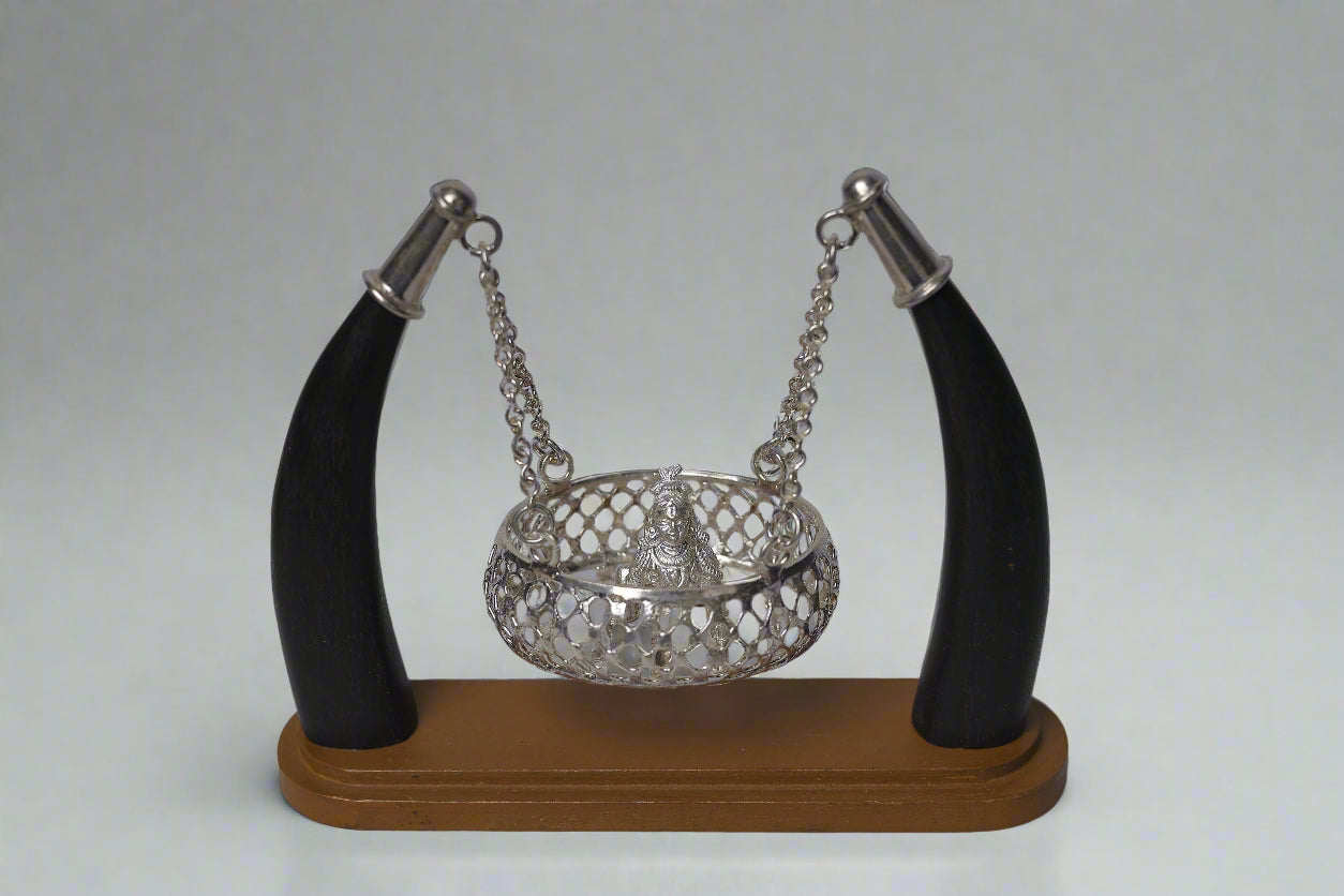 The Krishna’s Silver Swing beautifully captures the essence of divine grace, with Lord Krishna seated on a swing made of fine silver, and a wooden platform supporting the structure. This masterfully crafted figurine combines the elegance of silver with the warmth of wood, creating a striking and timeless piece. The intricate design and serene depiction of Krishna make it a perfect symbol of peace, devotion, and artistic craftsmanship for any space.