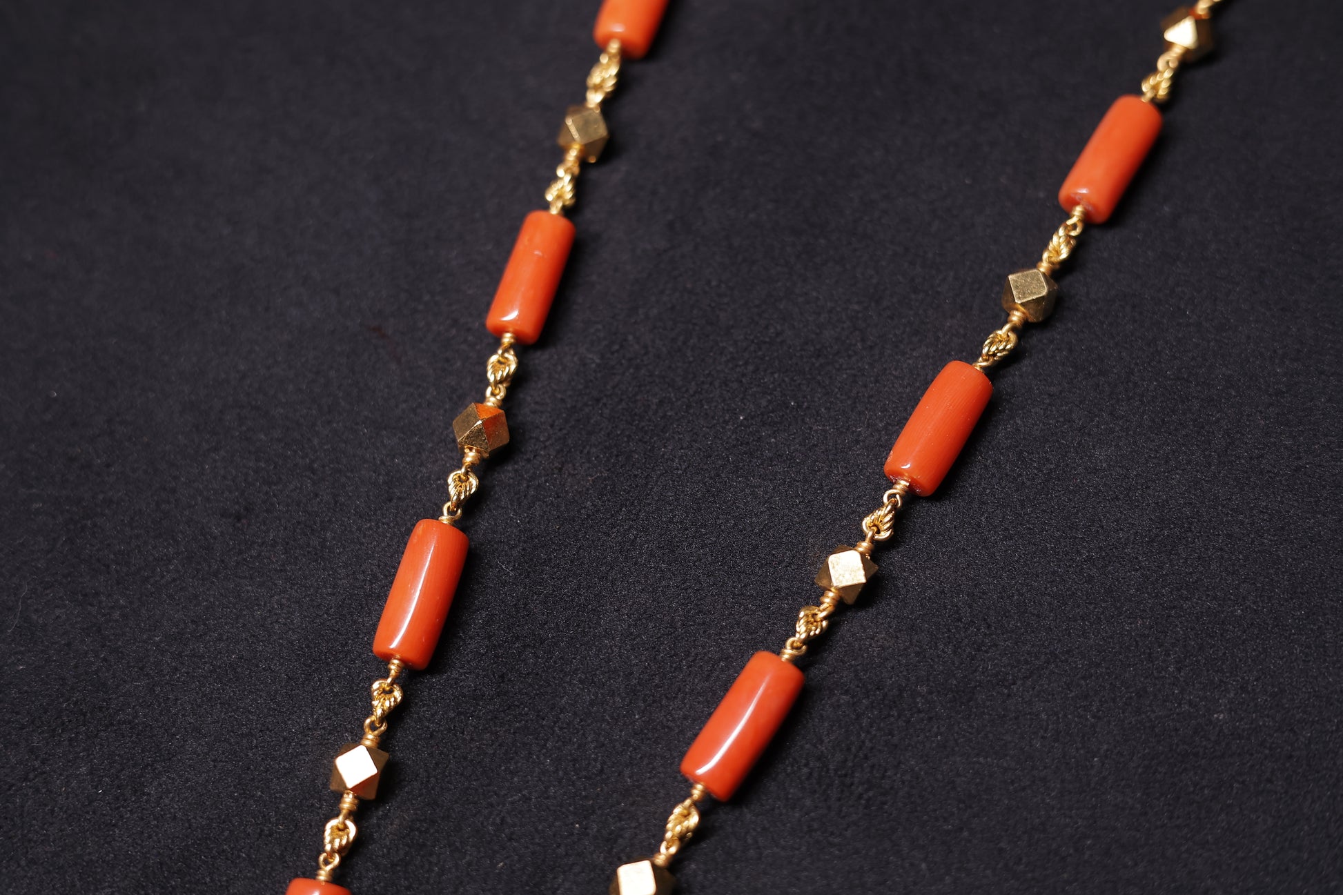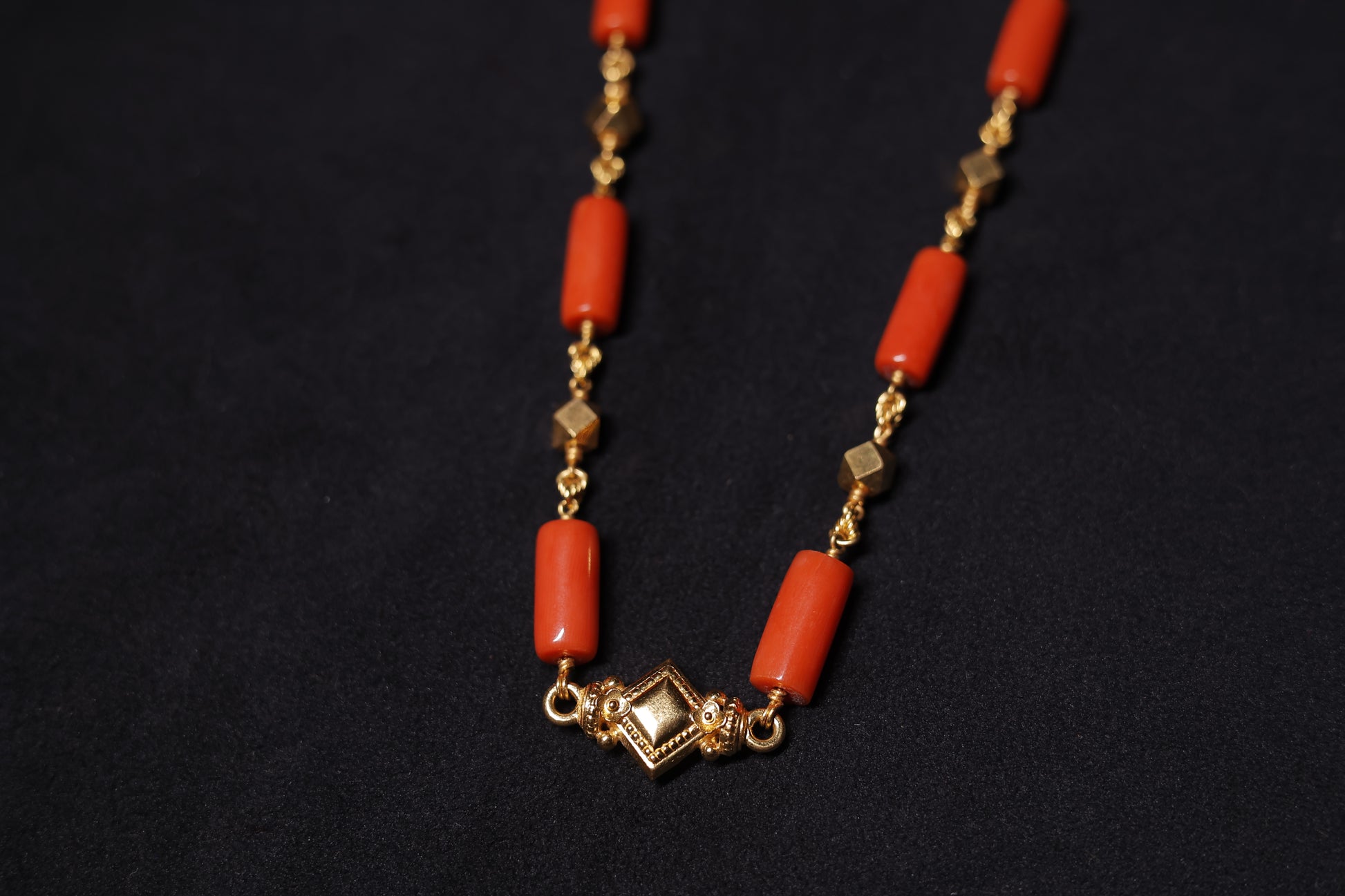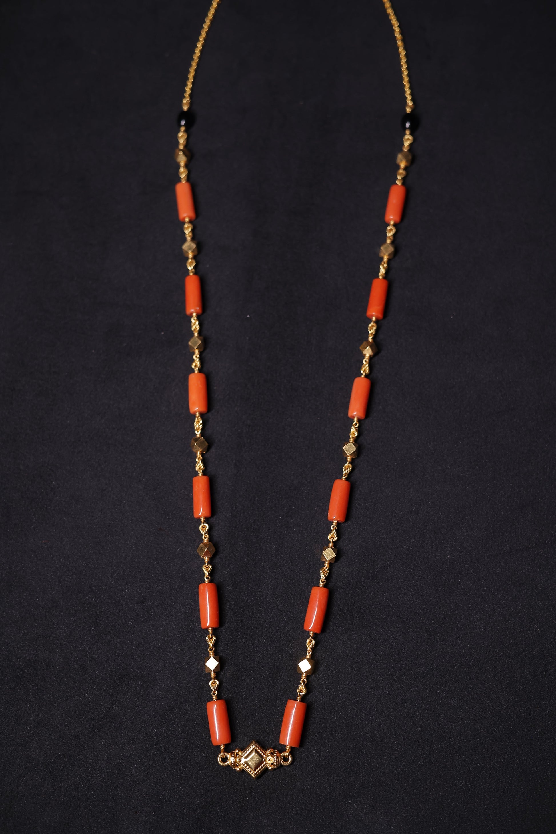 A beautifully minimal yet elegant gold necklace featuring delicate red cylindrical beads interwoven with fine gold detailing. The subtle design adds a touch of sophistication, making it a perfect choice for those who appreciate understated luxury with a traditional essence. Ideal for both casual and festive wear, this piece seamlessly blends grace with timeless charm.