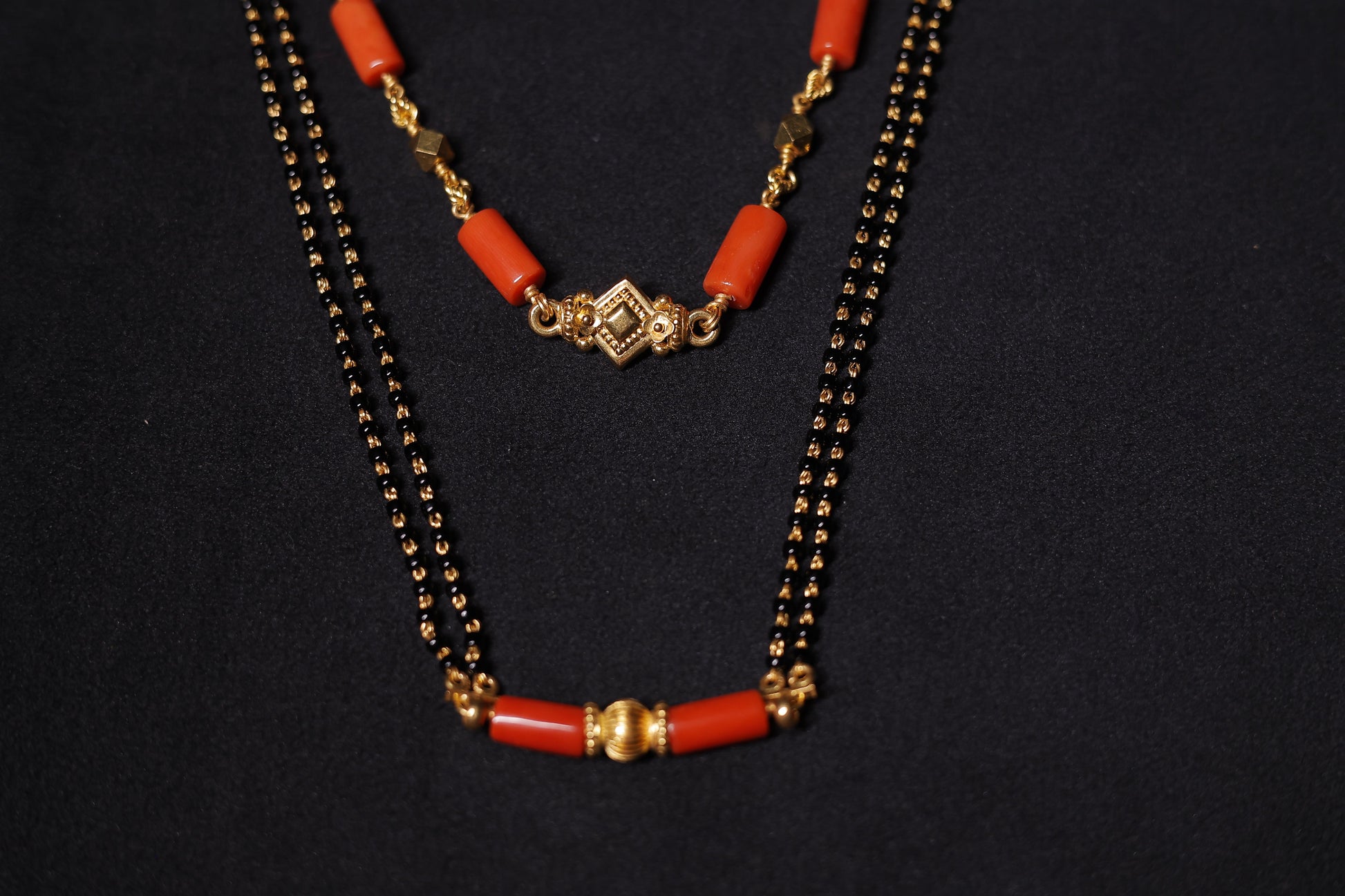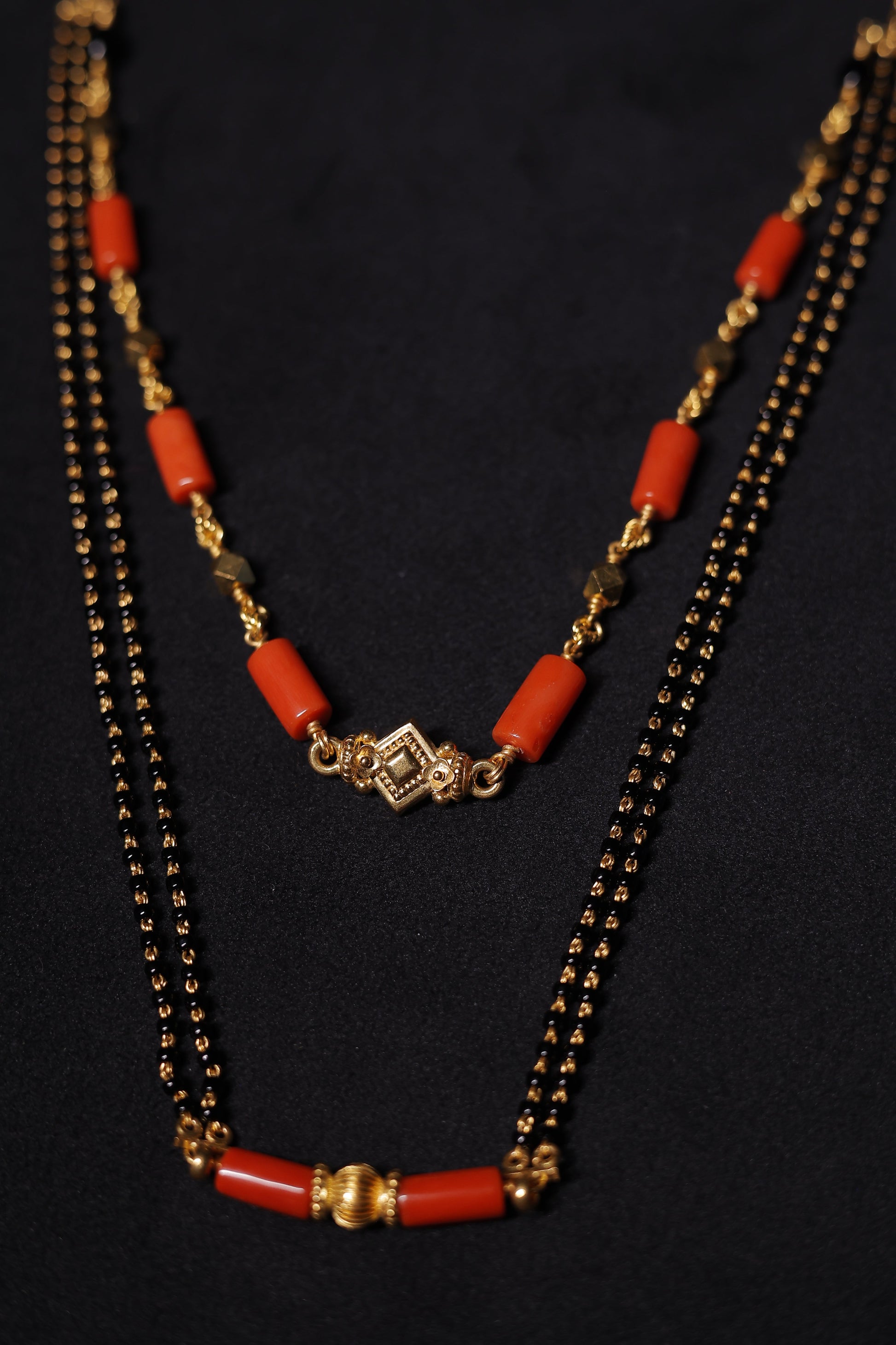 A gracefully designed two-layered mangalsutra that exudes traditional charm with a modern touch. Featuring cylindrical red beads elegantly woven into intricate gold patterns, this masterpiece symbolizes love, commitment, and prosperity. The delicate craftsmanship enhances its appeal, making it a perfect blend of heritage and sophistication for everyday wear or special occasions.