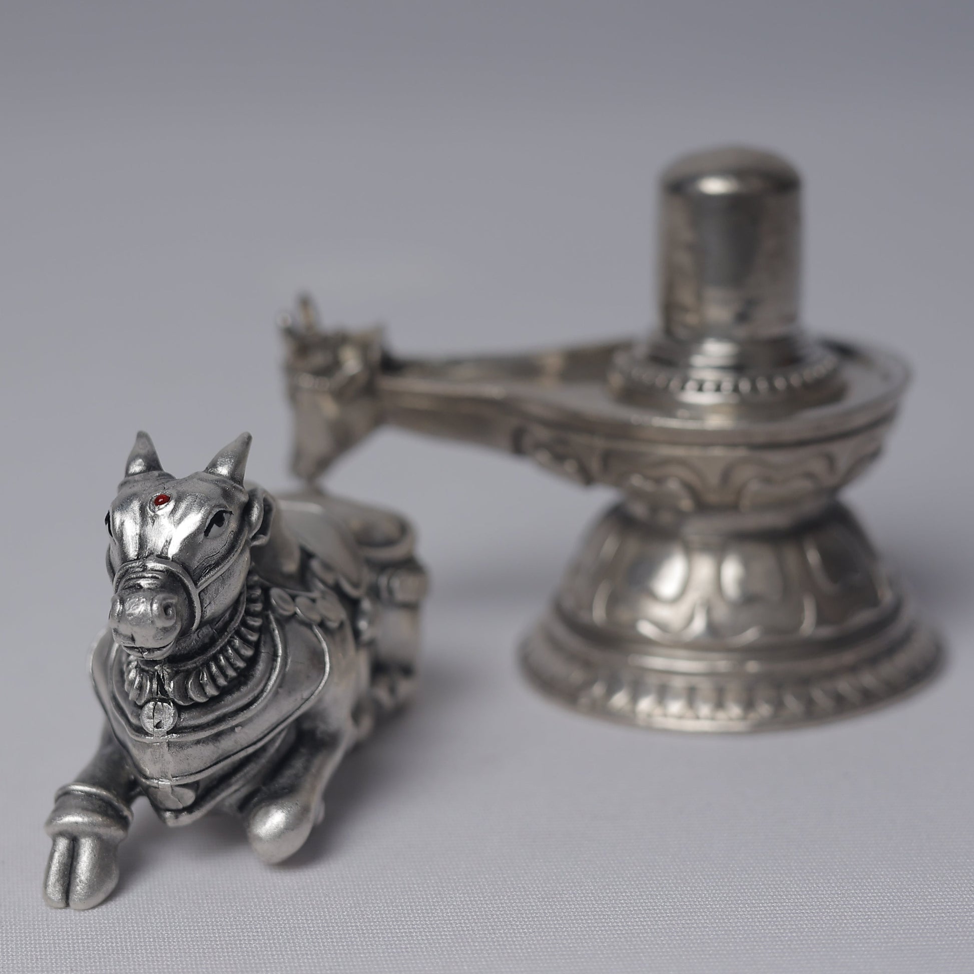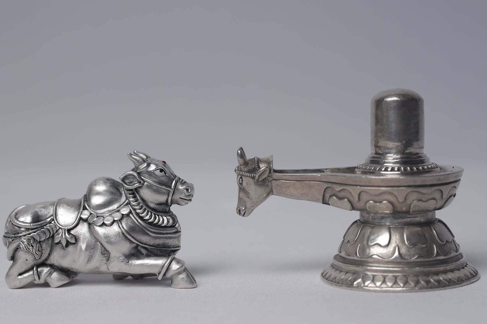 This exquisite silver Nandi sculpture showcases the beauty of intricate craftsmanship. The detailed features and polished finish highlight the strength and serenity that Nandi represents. A symbol of devotion and power, this idol serves as both a spiritual and decorative piece, adding grace to any space with its divine presence.