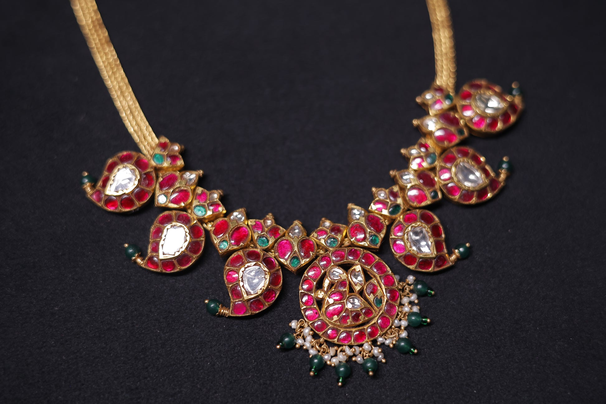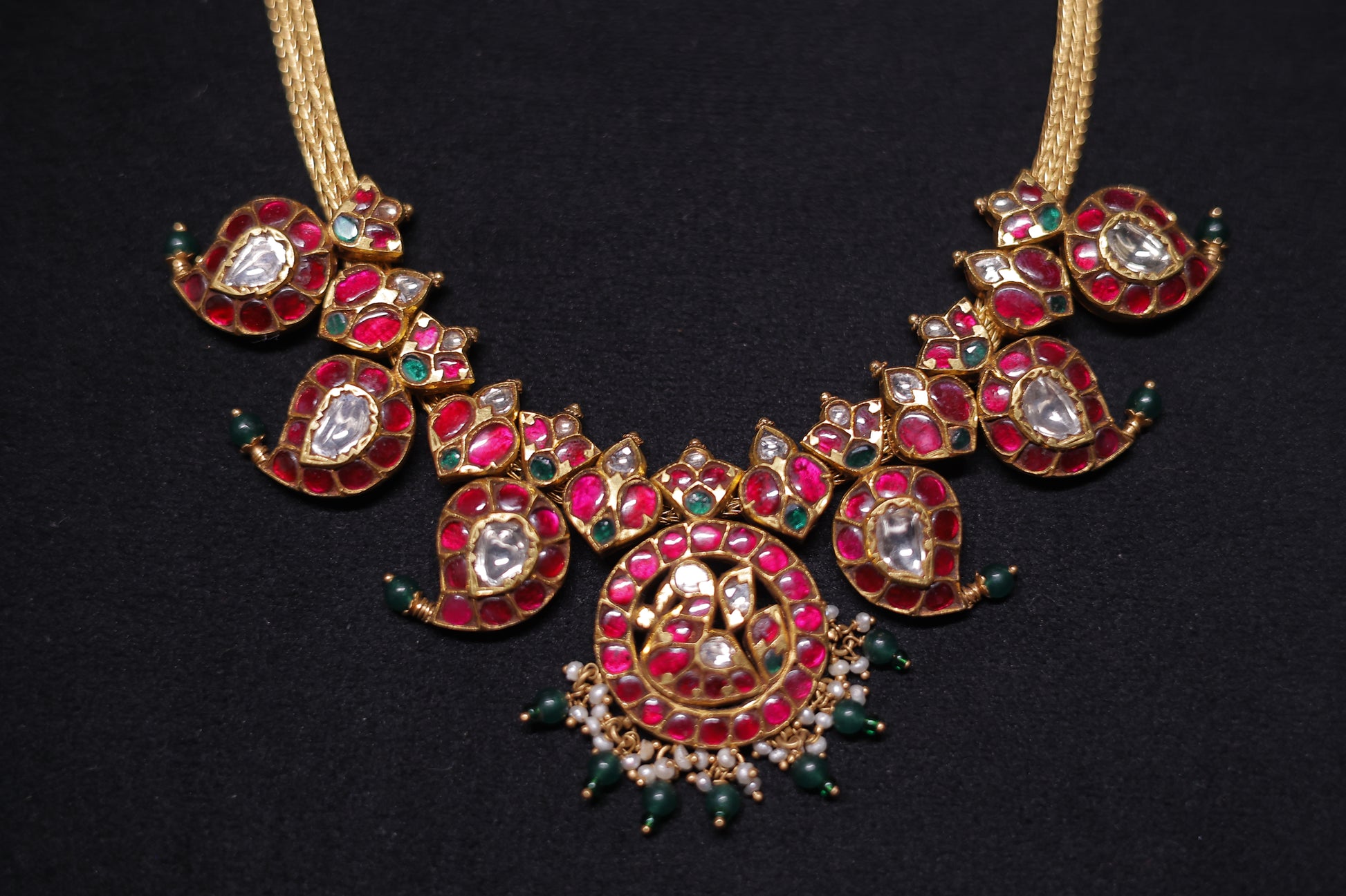 This opulent gold necklace features a breathtaking temple-inspired design, adorned with uncut Kundan stones and vibrant red and green gemstones. The intricate detailing, paired with delicate pearl and emerald bead accents, enhances its regal aura. A masterpiece of heritage craftsmanship, this necklace is perfect for grand celebrations and traditional attire.