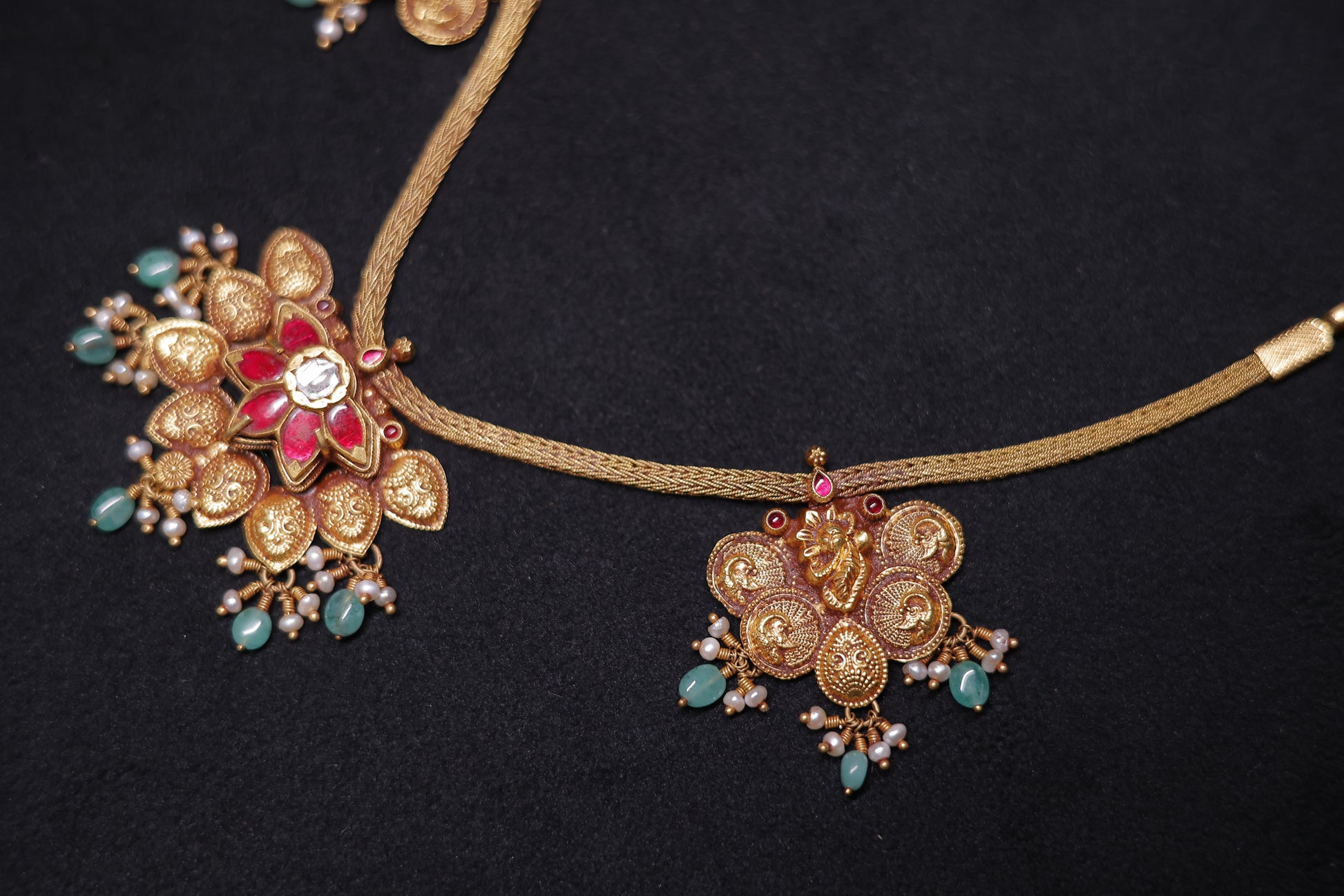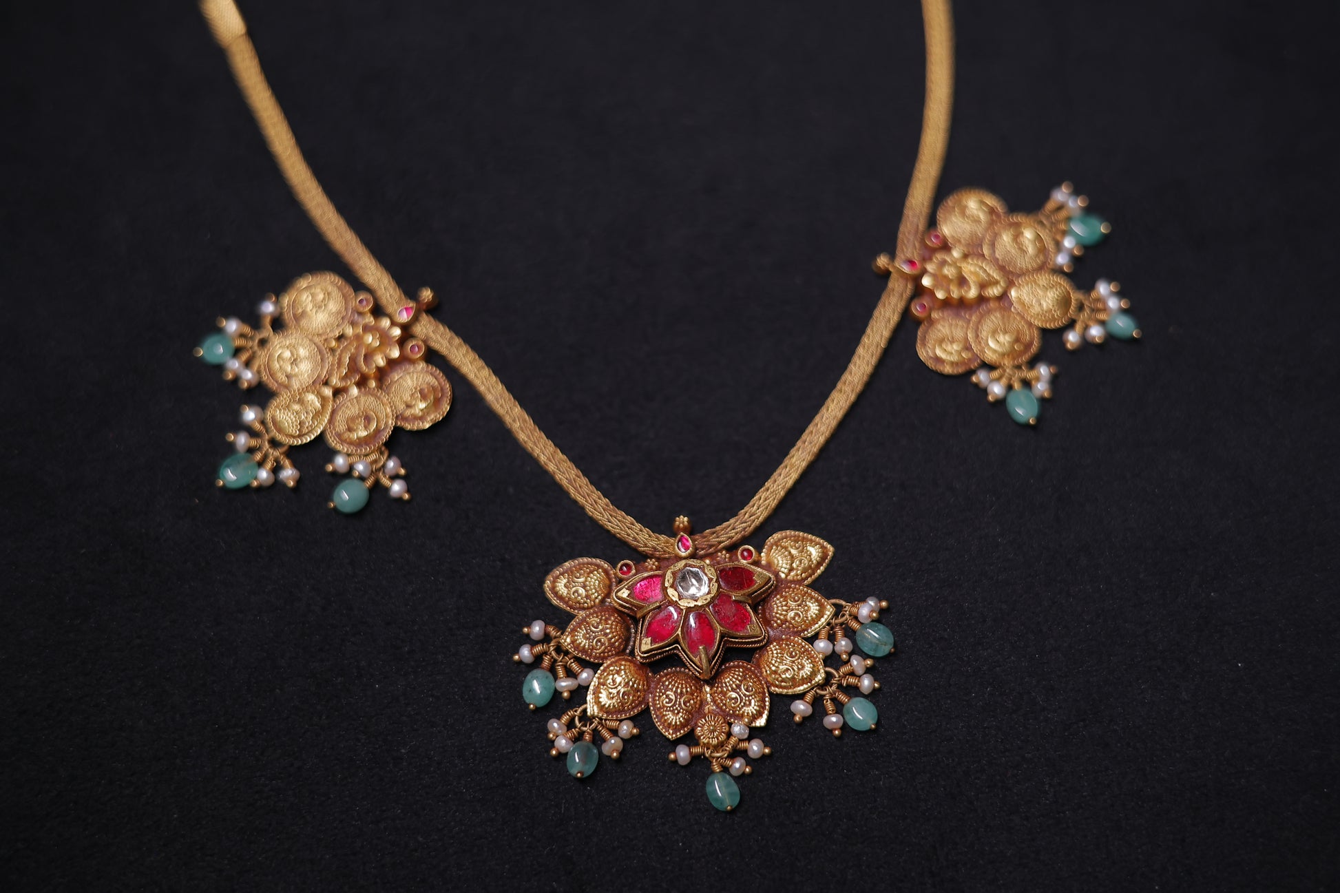This exquisite gold necklace showcases a mesmerizing floral motif at its center, adorned with a radiant red gemstone and intricate gold detailing. The side pendants feature delicate circular patterns, accented with soft green beads for a touch of elegance. A perfect blend of heritage and craftsmanship, this necklace is ideal for festive occasions and traditional attire.