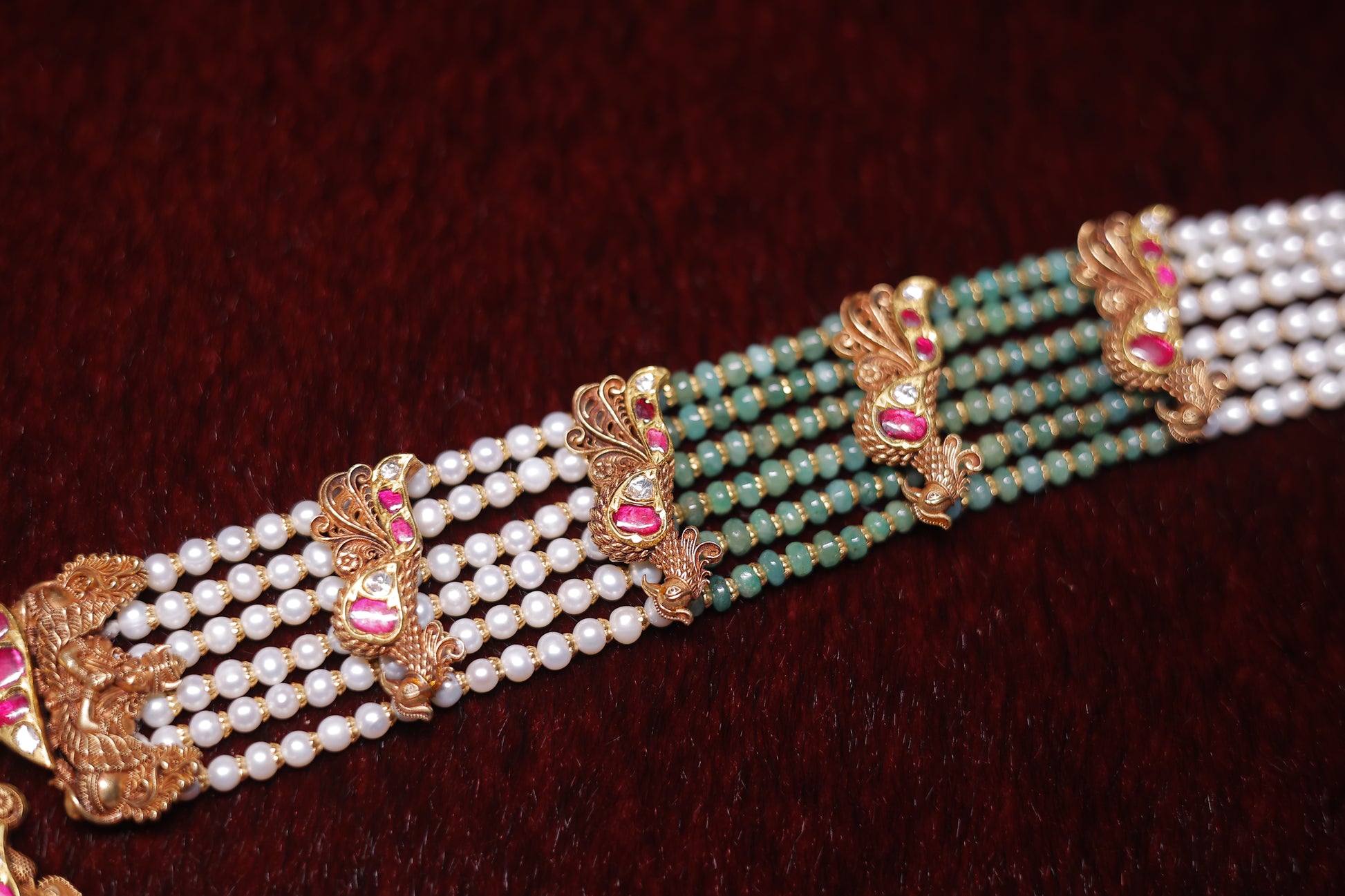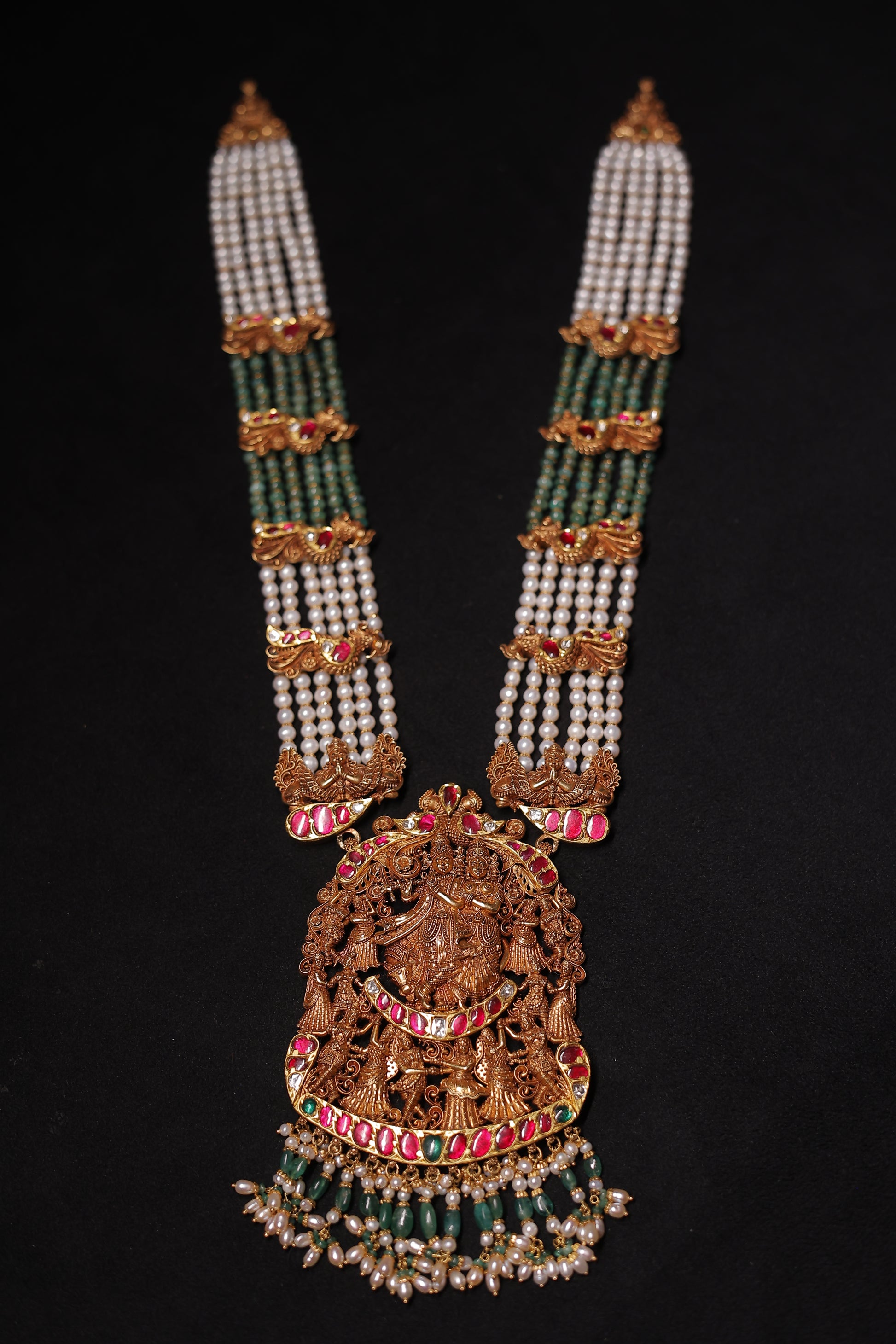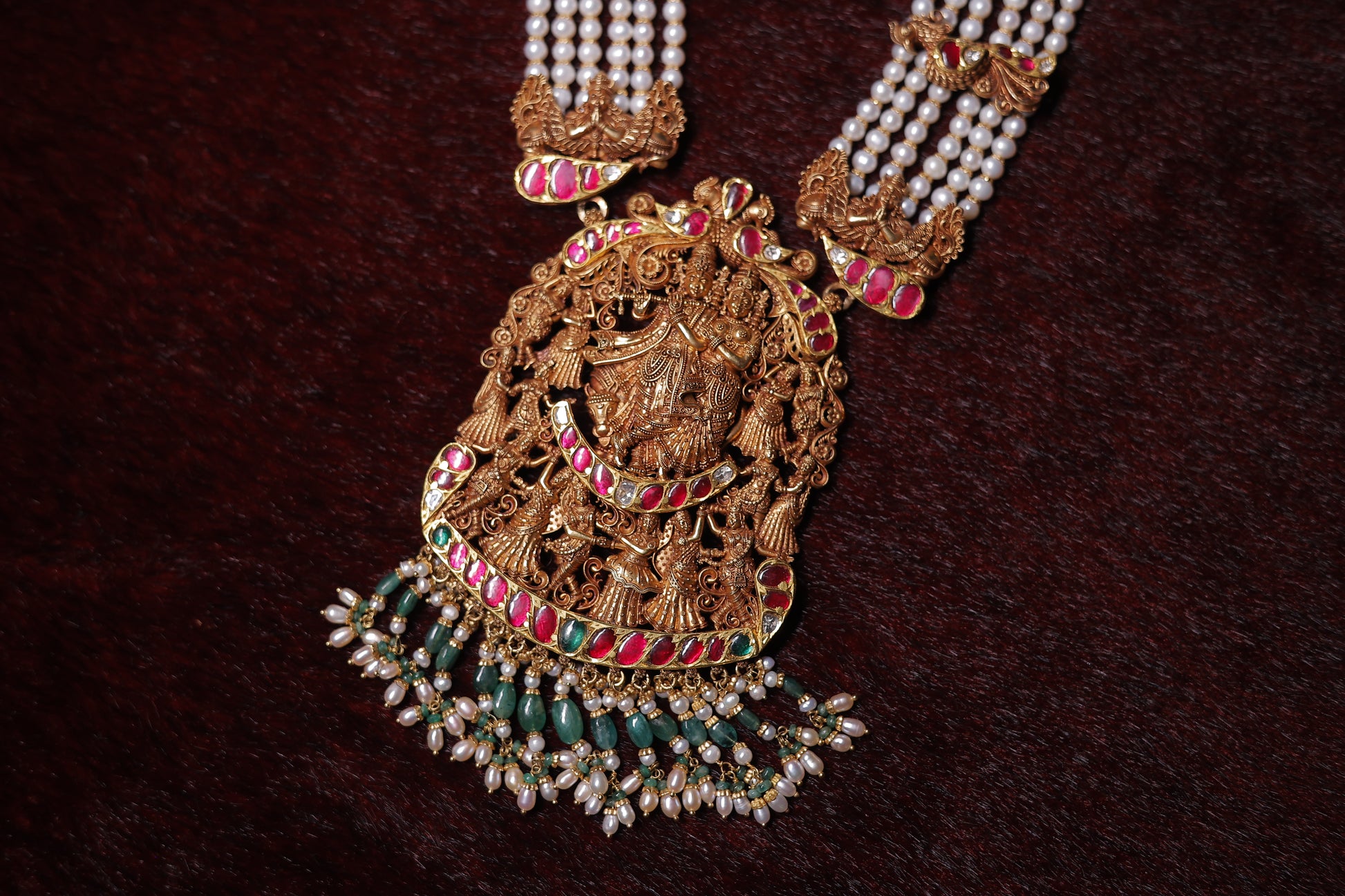 This exquisite Lakshmi temple haram is a perfect blend of tradition and artistry, designed for brides who seek grandeur. The necklace features intricate gold craftsmanship, showcasing a detailed Lakshmi pendant adorned with ruby, emerald, and pearl embellishments. The layered pearl and green bead strands, accentuated with ornate gold connectors, add to its regal charm. Ideal for weddings and festive occasions, this haram embodies prosperity, devotion, and timeless elegance.