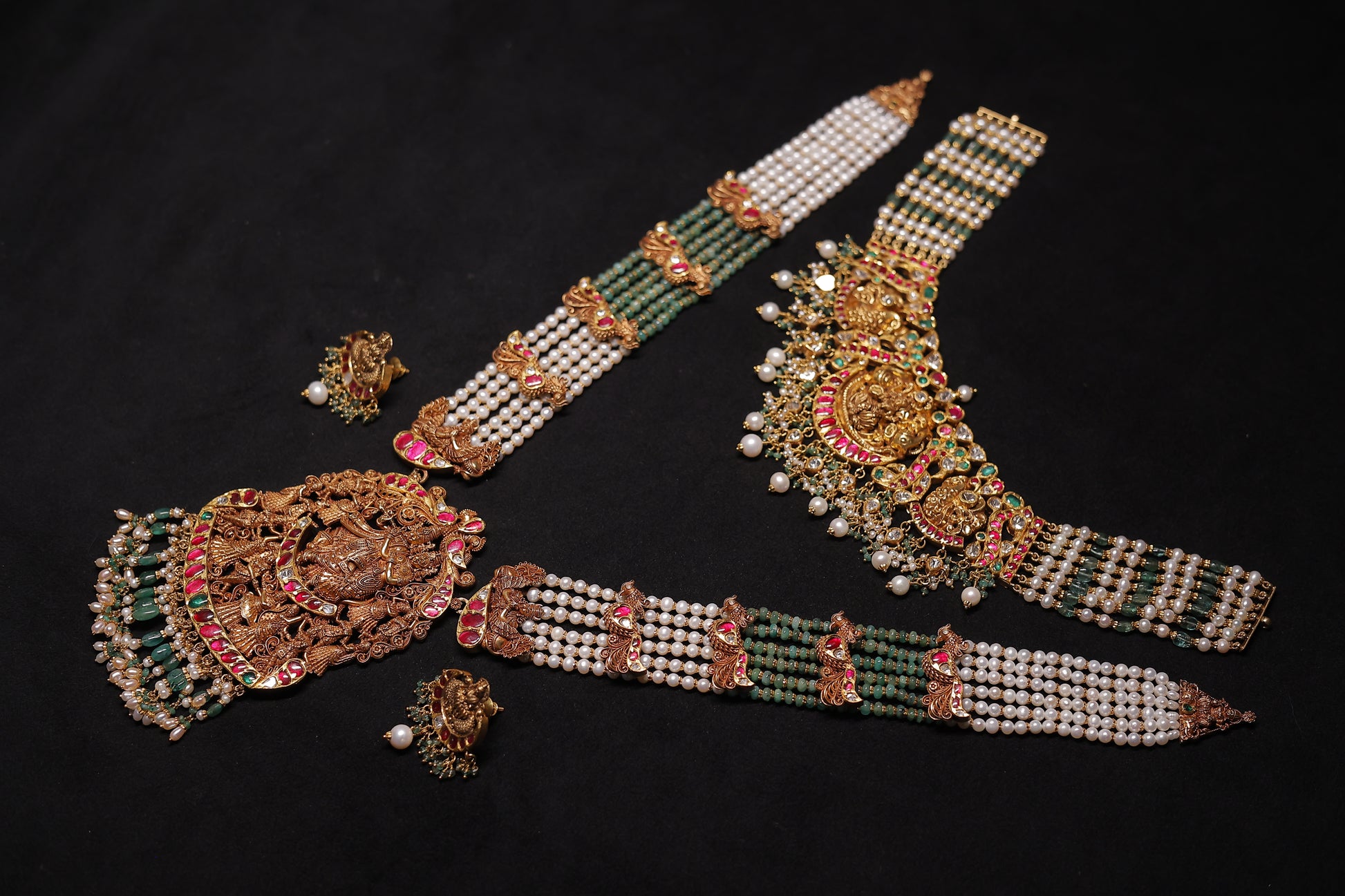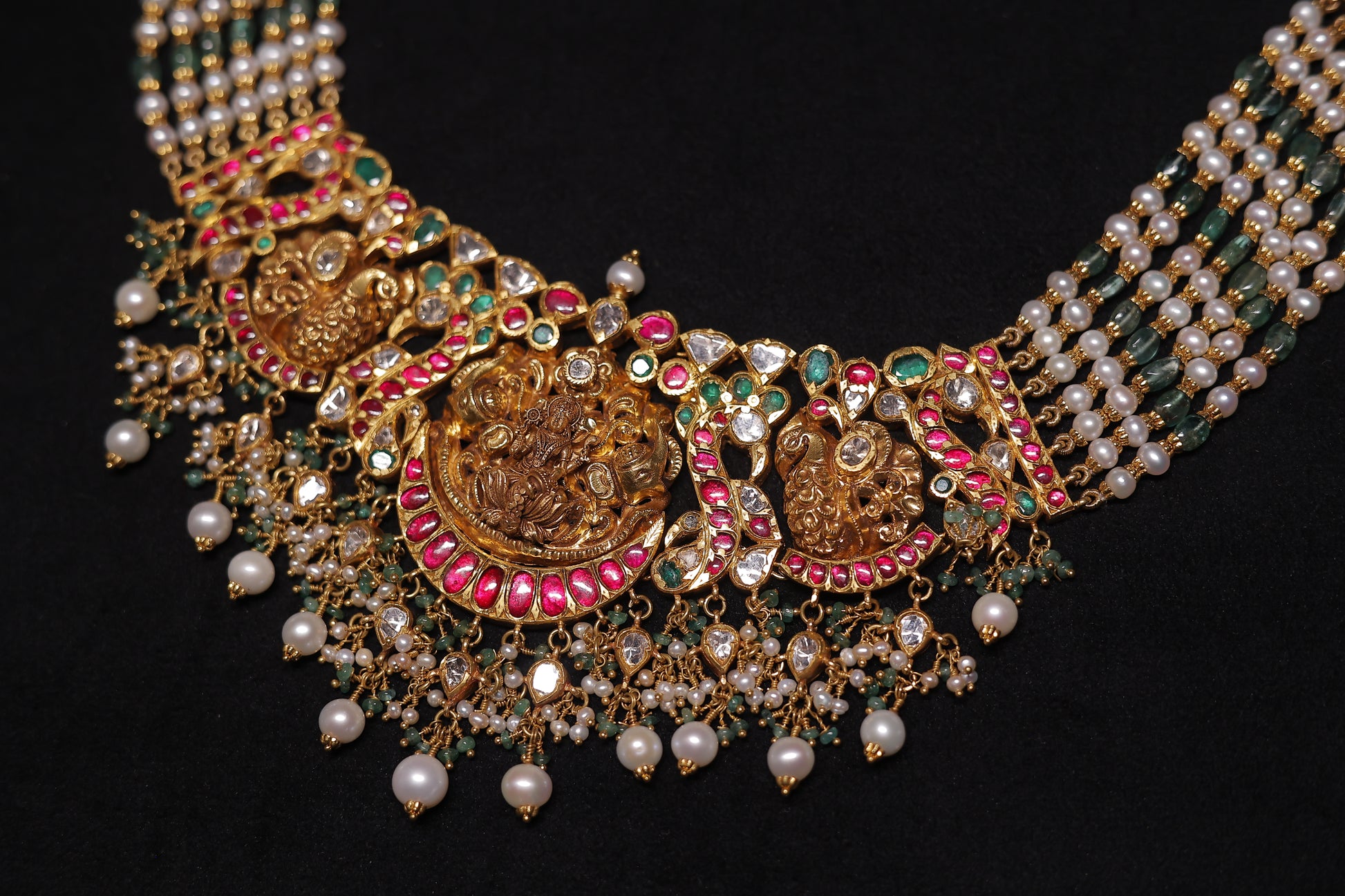 A masterpiece of traditional craftsmanship, this opulent bridal jewelry set features a grand temple-style choker paired with a long Lakshmi haram. The choker, adorned with intricate gold motifs, precious stones, and pearl embellishments, exudes regal charm. The long haram showcases layers of pearl and green beads, leading to a divine Lakshmi pendant, symbolizing prosperity and grace. Matching statement earrings complete the ensemble, making it a perfect choice for brides who seek a blend of heritage and grandeur.
