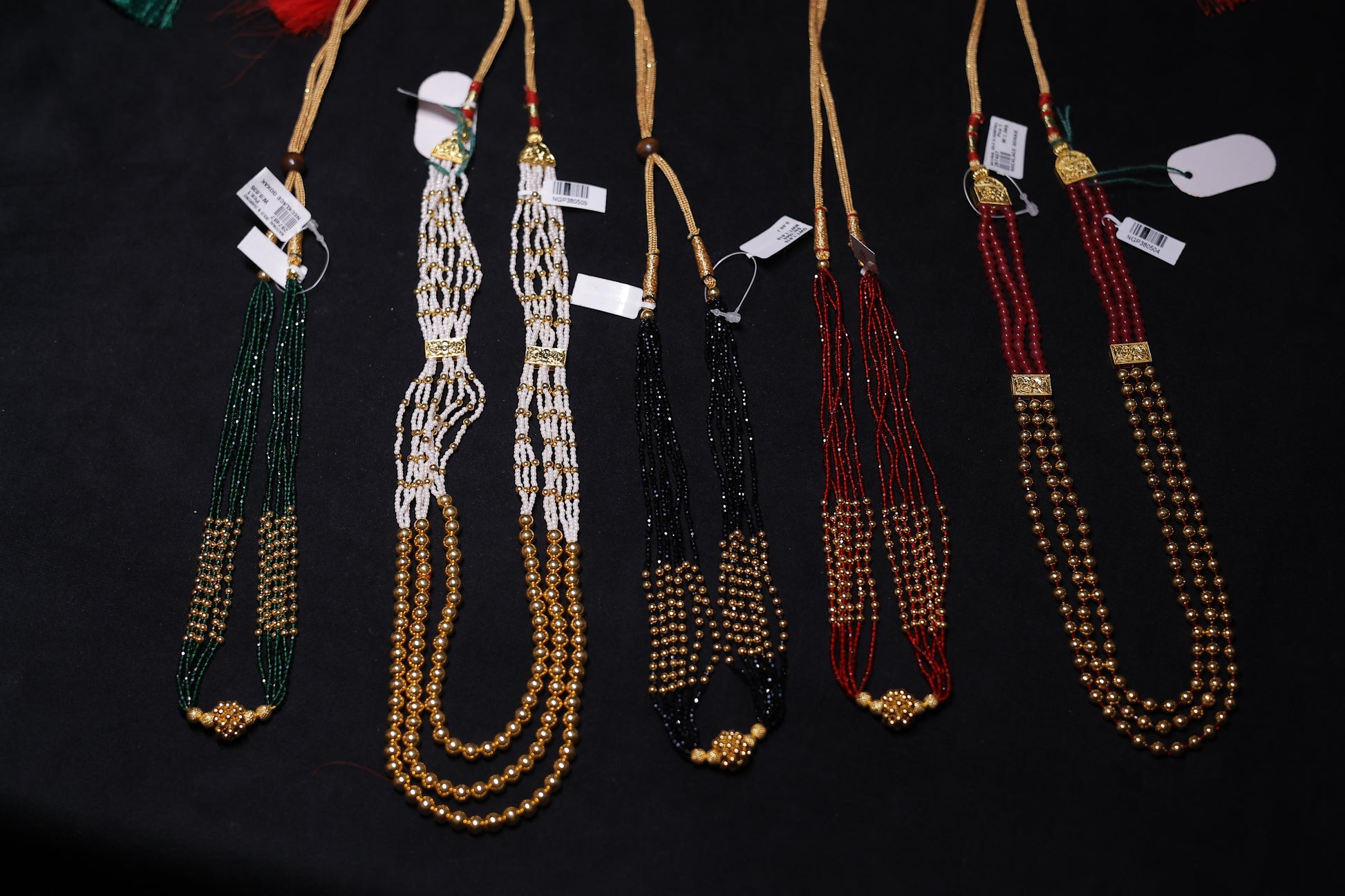 A mesmerising collection of gold wax Malas, each crafted with intricate detailing and adorned in vibrant hues of green, red, and deep black. These stunning pieces feature delicate gold accents, lending a touch of tradition and grace to every design. Lightweight yet rich in heritage, this versatile set is perfect for adding a hint of timeless charm to any look, making it an essential addition to every jewellery collection.