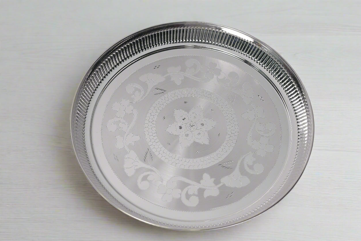 This silver plate features a beautifully detailed floral design at the center, encircled by a delicate ring of leaf motifs. The intricate craftsmanship and elegant pattern make it a standout piece, perfect for both functional use and display. Ideal for serving or as a decorative accent, this plate brings a timeless, refined touch to any setting.