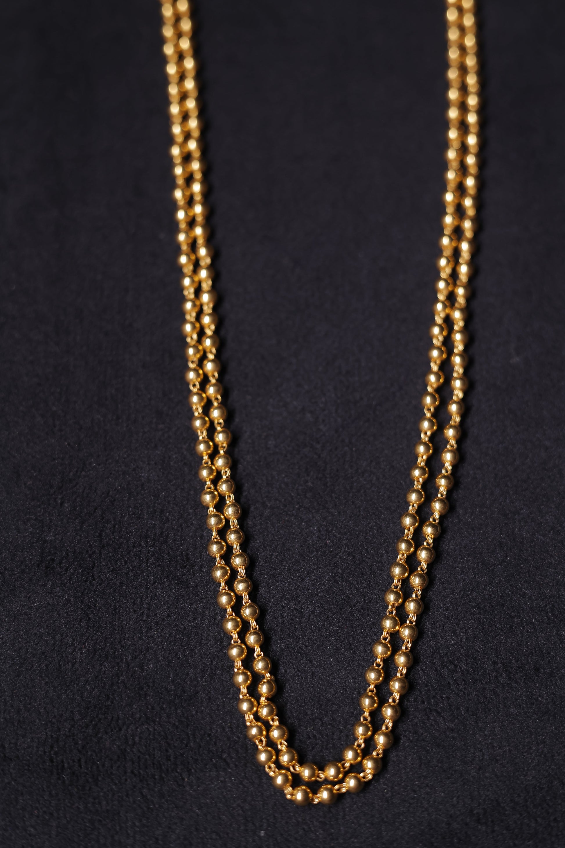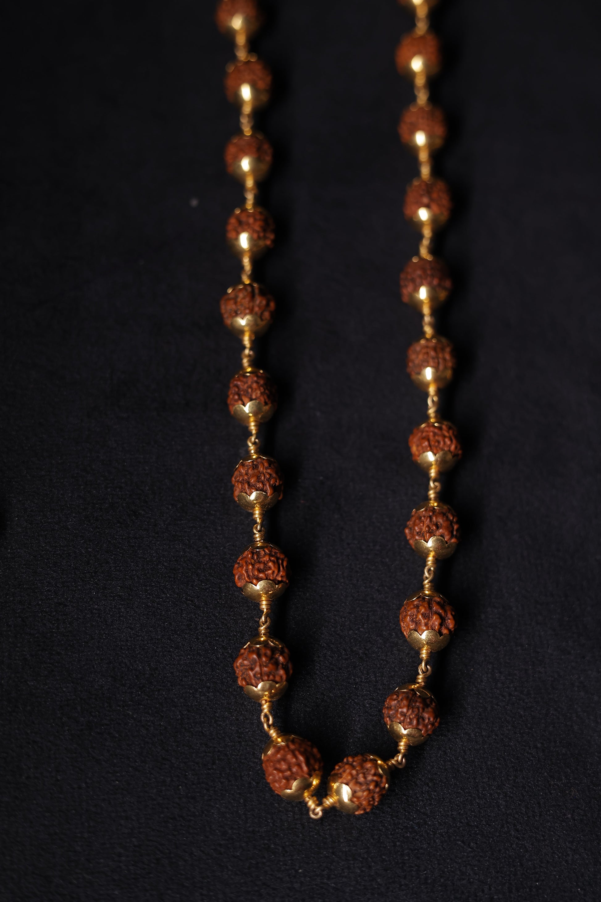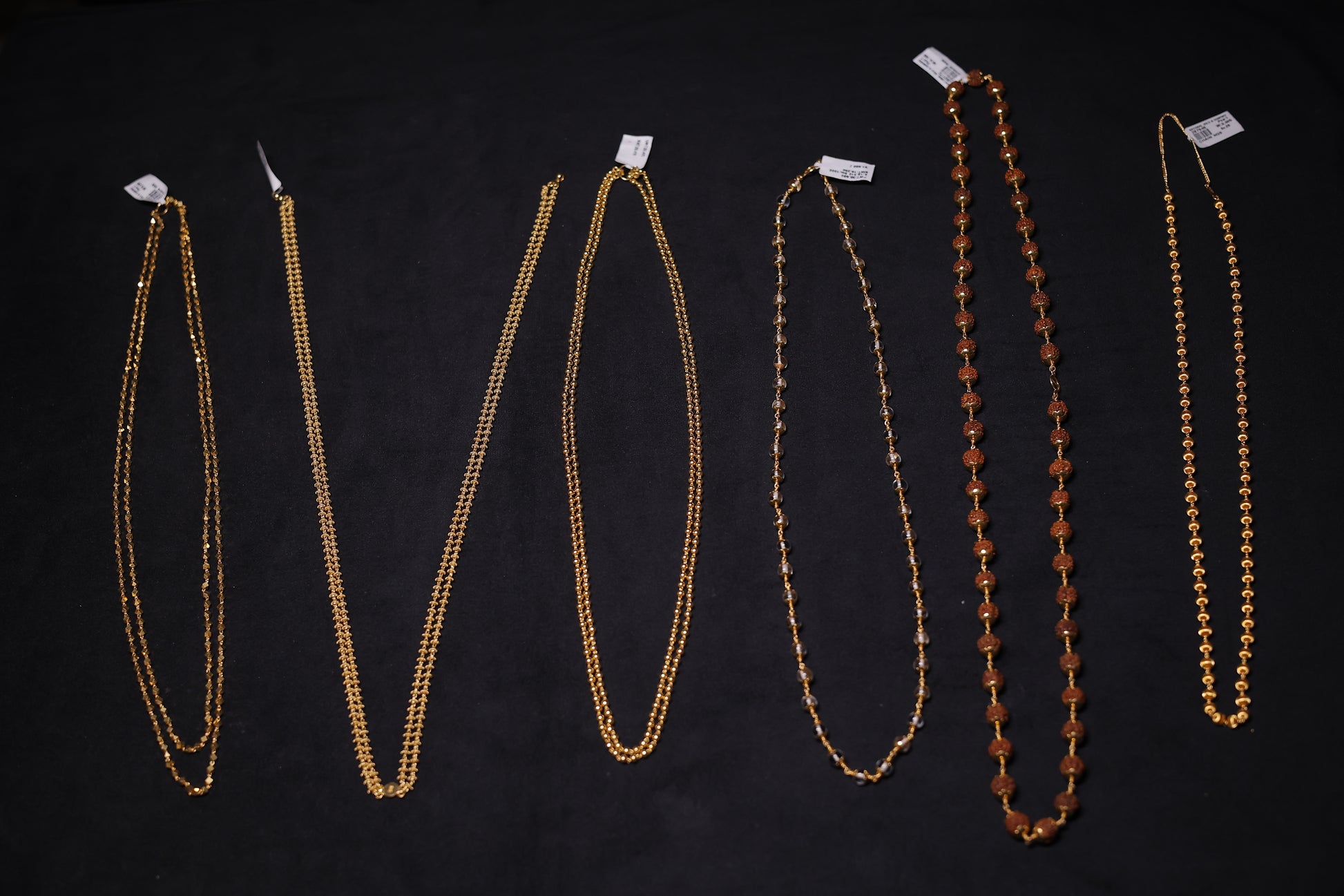 A diverse array of neckpieces, each with its unique charm. From classic gold bead strands to spiritual Rudraksha designs, this collection seamlessly blends tradition with elegance, offering something special for every style.