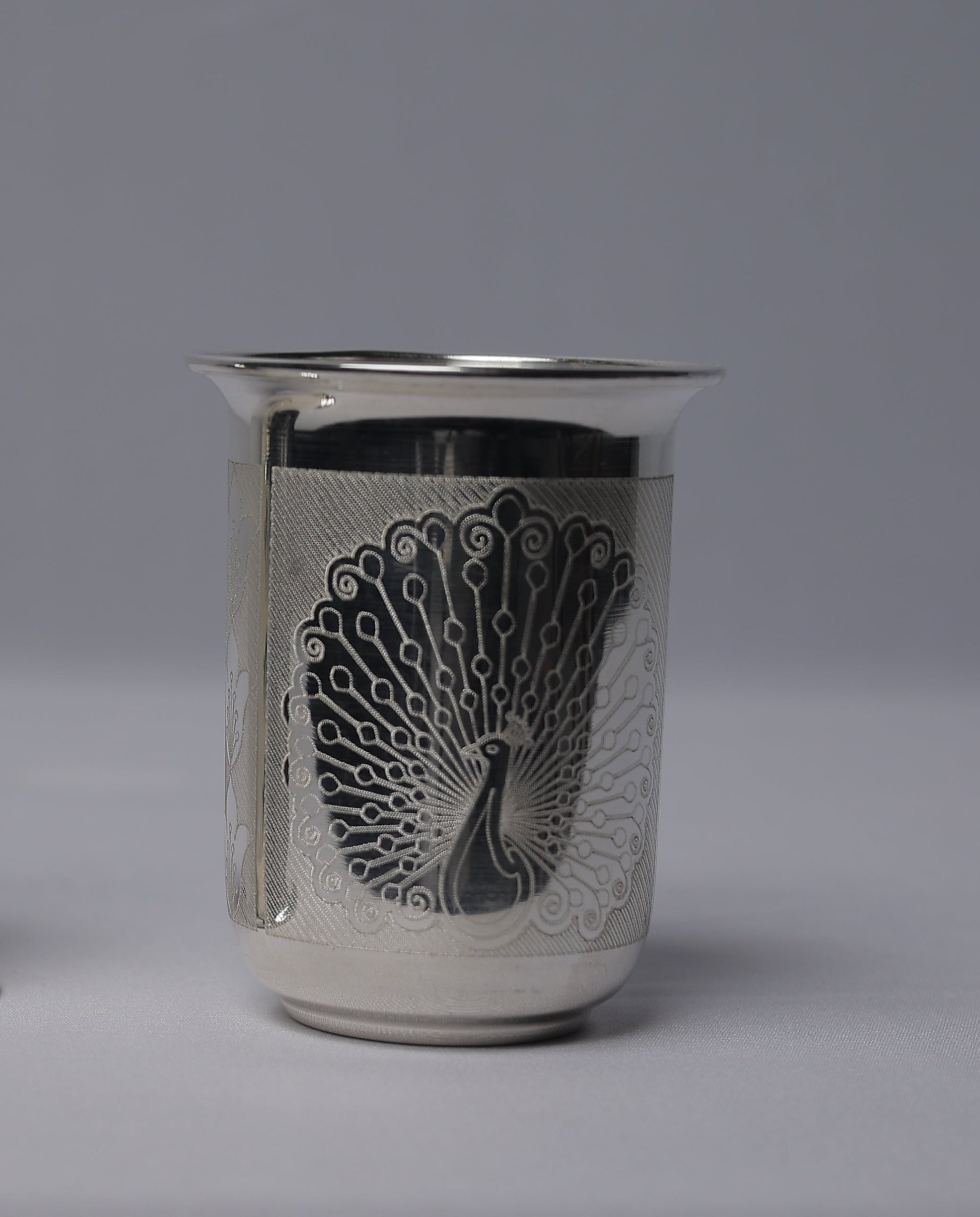 The Majestic Peacock Silver Cup is a symbol of regal elegance, featuring a stunning peacock design intricately embossed on its surface. Crafted from high-quality silver, the cup exudes timeless beauty and charm. The graceful peacock motif adds a touch of artistry, making it not only a functional piece but also a striking work of craftsmanship.