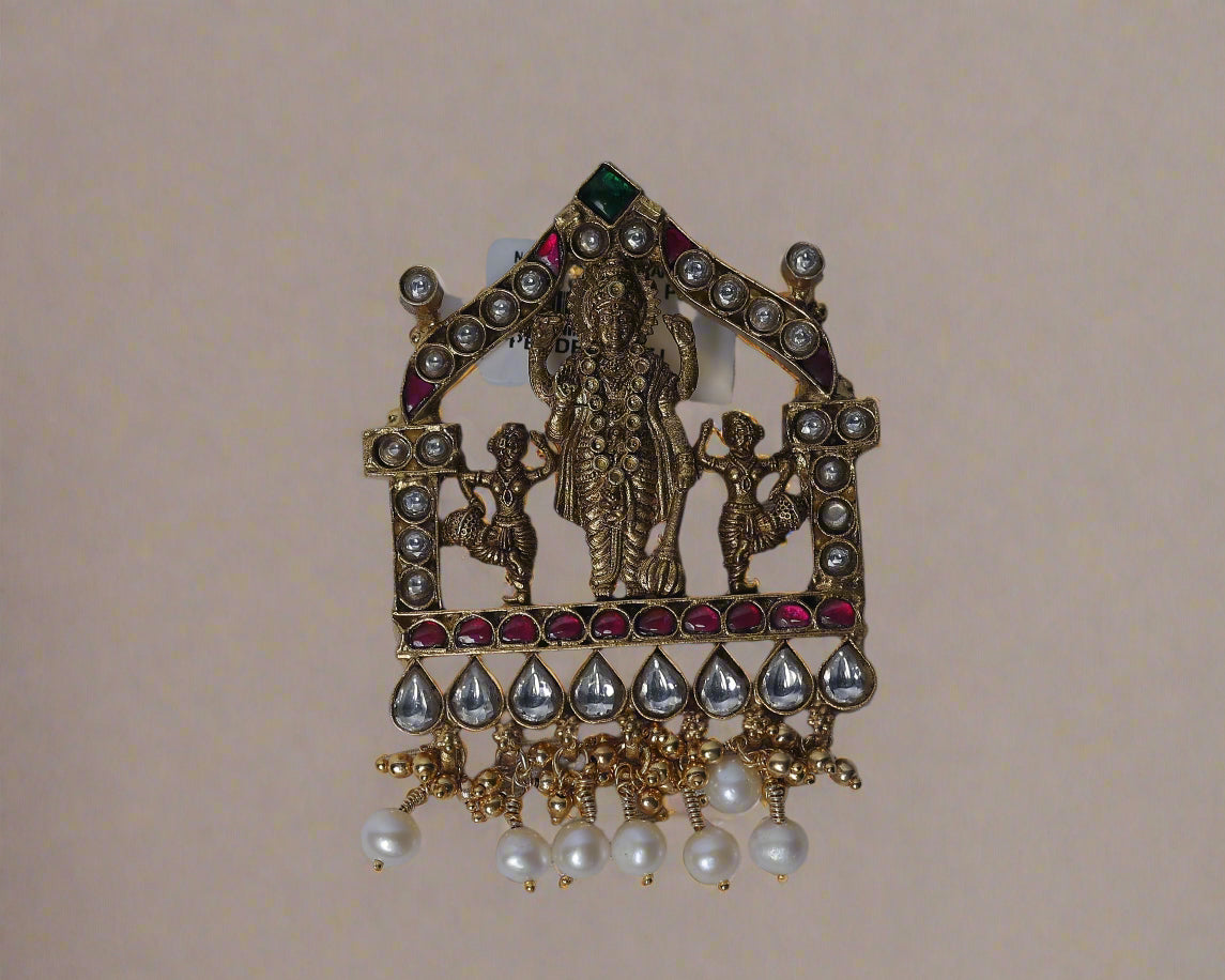 This exquisite Jadebille is crafted in silver with a rich gold polish, showcasing intricate detailing that reflects timeless craftsmanship. The delicate hanging pearls add a touch of elegance, enhancing its regal charm. Every curve and motif is finely designed, making it a true statement piece. With its perfect blend of tradition and artistry, this Jadebille stands as a symbol of beauty and heritage, ideal for special occasions and cultural celebrations.