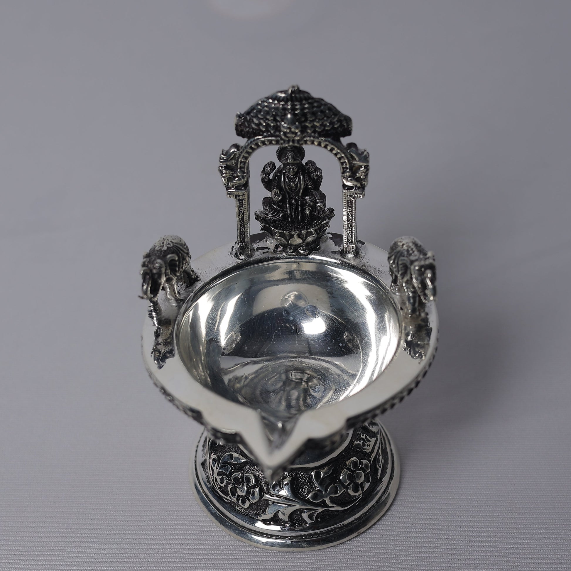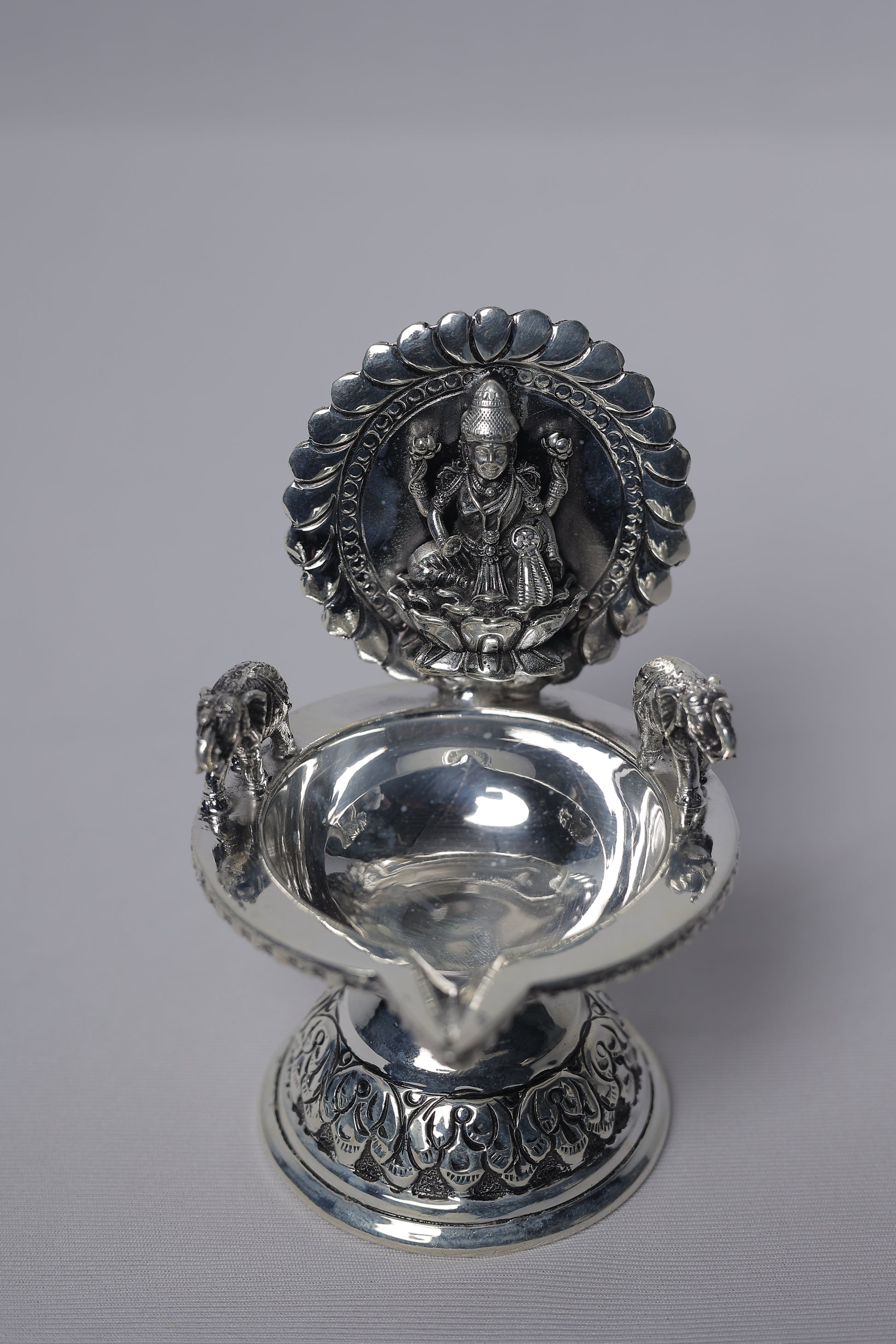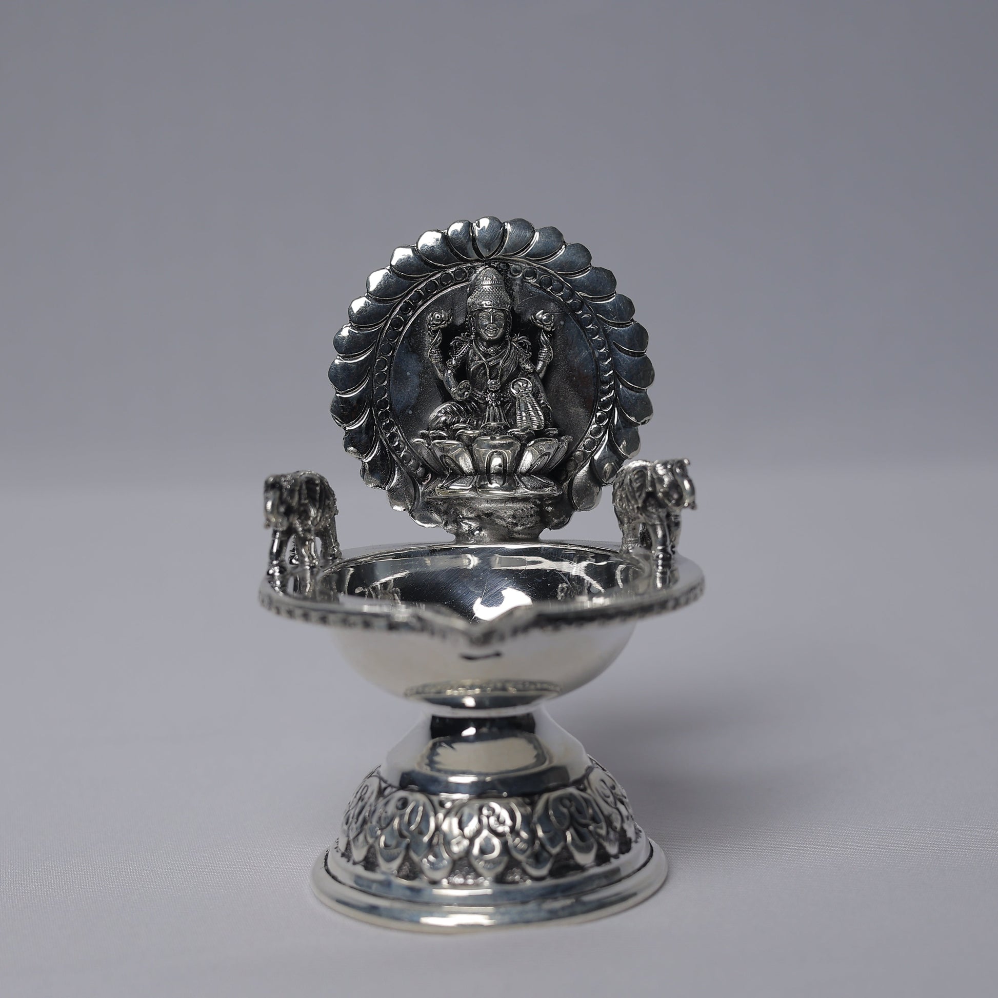 A beautifully crafted silver diya featuring an intricately designed idol of Goddess Laxmi on the top. The detailing enhances its divine appeal, making it a perfect blend of elegance and tradition. Ideal for sacred rituals, celebrations, or as a cherished gift.