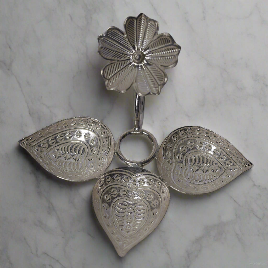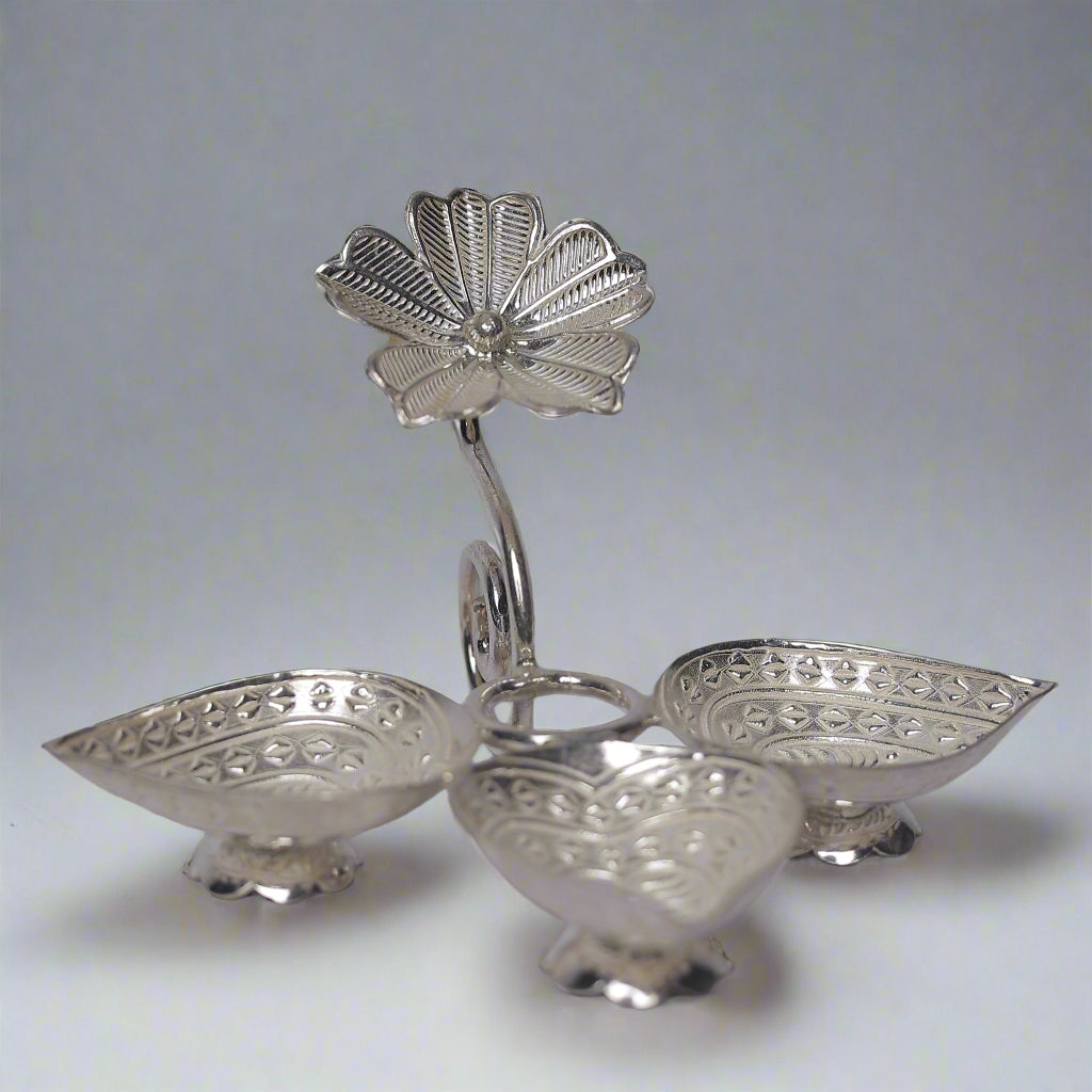 This silver diya features three leaf-shaped structures, each holding a light, with a delicate flower motif positioned in one of the four directions. The leaf elements symbolize growth and prosperity, while the flower adds a touch of beauty and elegance. This thoughtfully designed diya is perfect for enhancing the ambiance of spiritual rituals, bringing both light and grace to any sacred space.