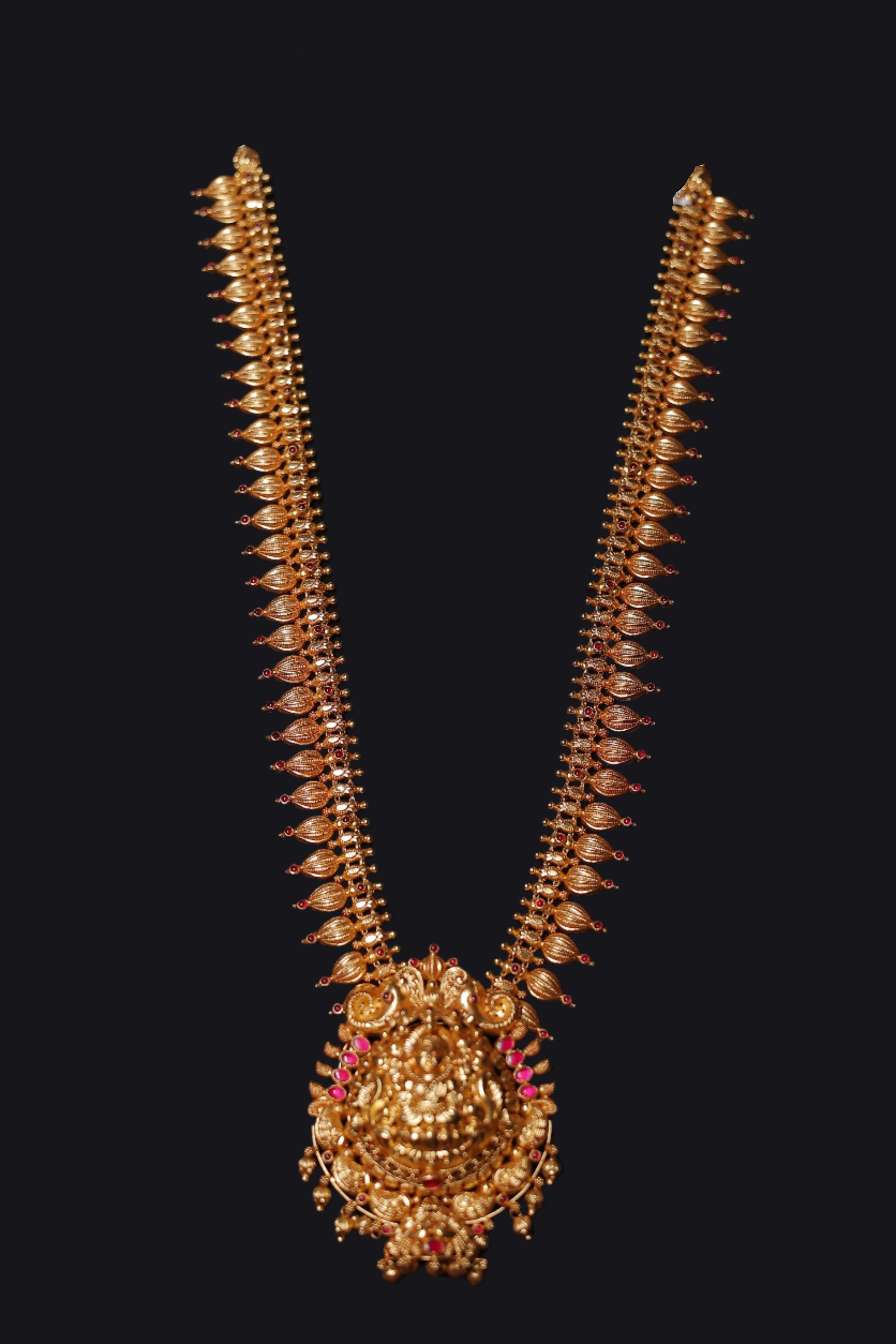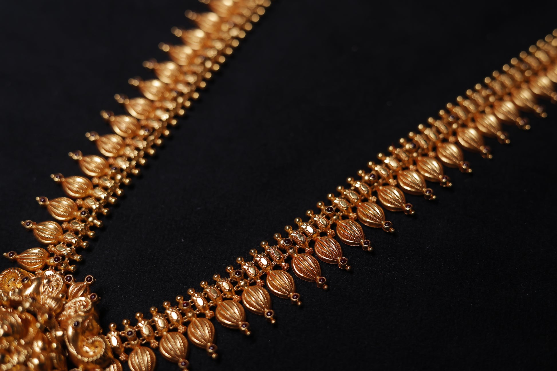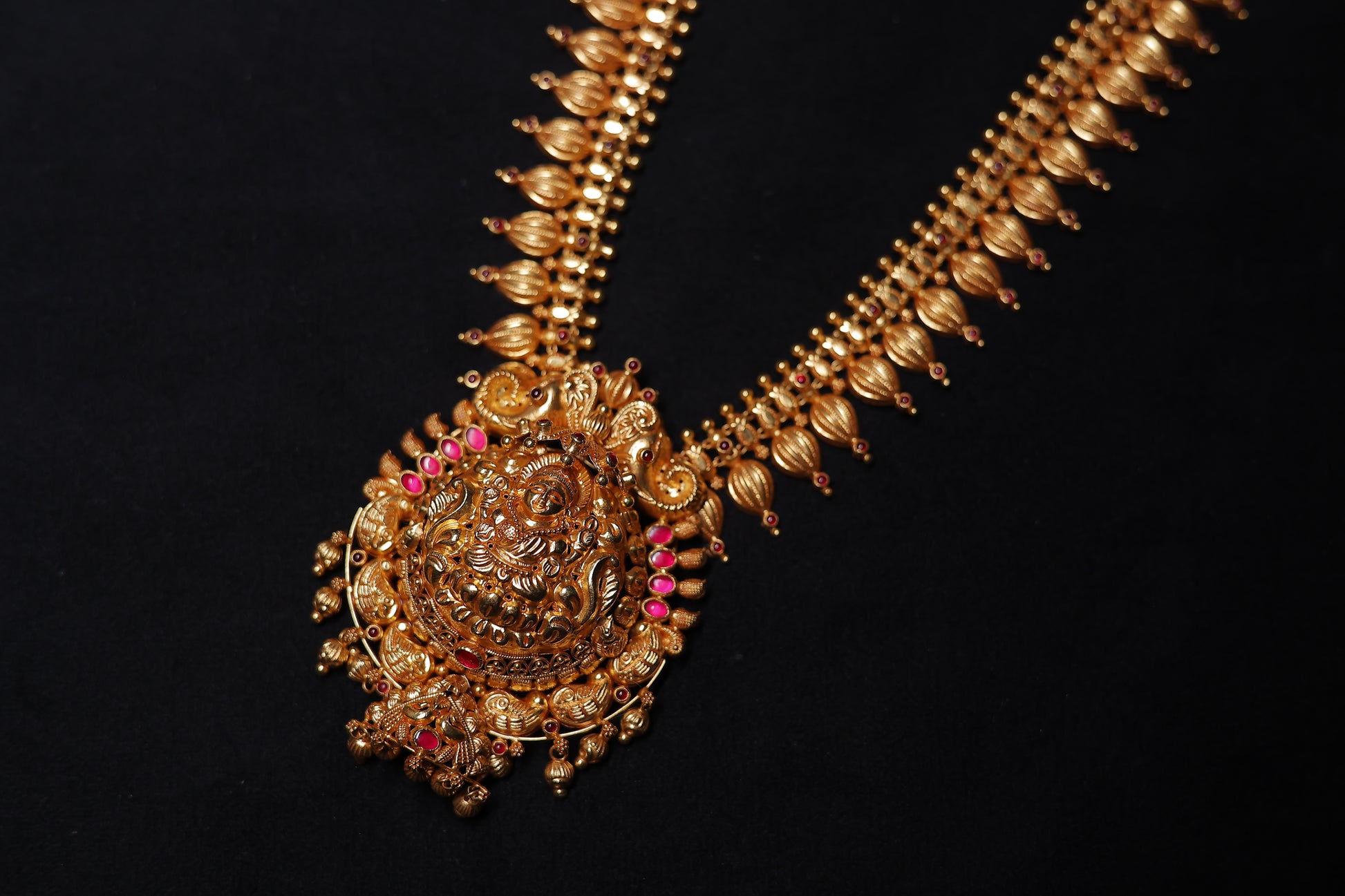 This exquisite temple-style gold necklace features a striking circular pendant, intricately designed with a standing Goddess Murthy at its centre. Encased within a beautifully detailed temple frame, the pendant radiates sacred charm and traditional artistry. Delicate red and gold ball hangings add a graceful touch, enhancing its regal appeal. A perfect blend of devotion and elegance, this piece is a timeless treasure for those who cherish heritage and divine beauty.