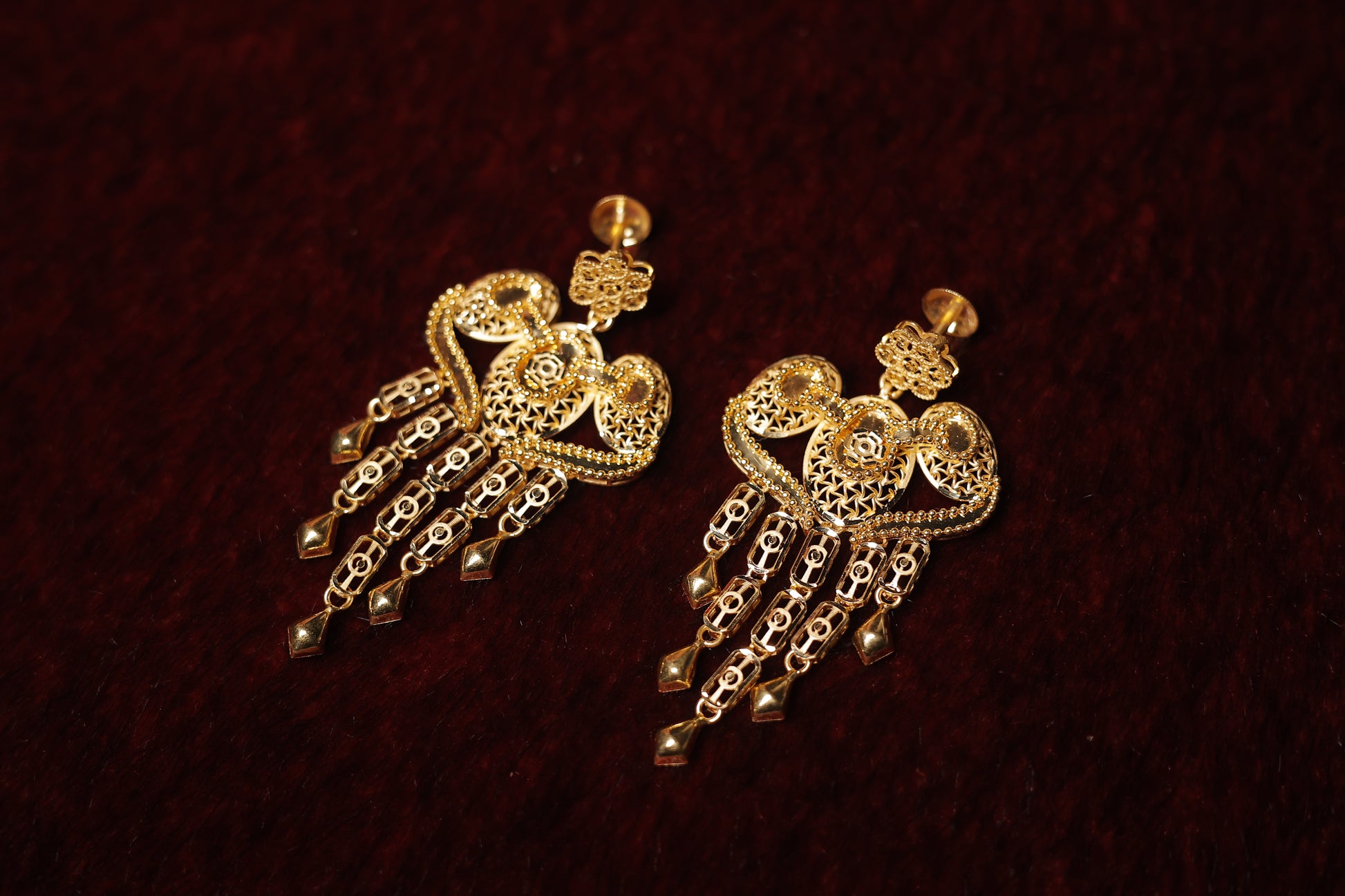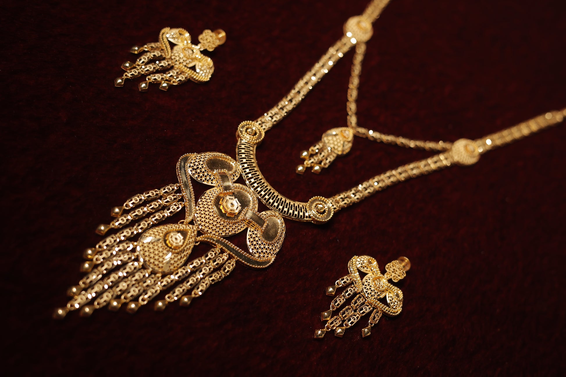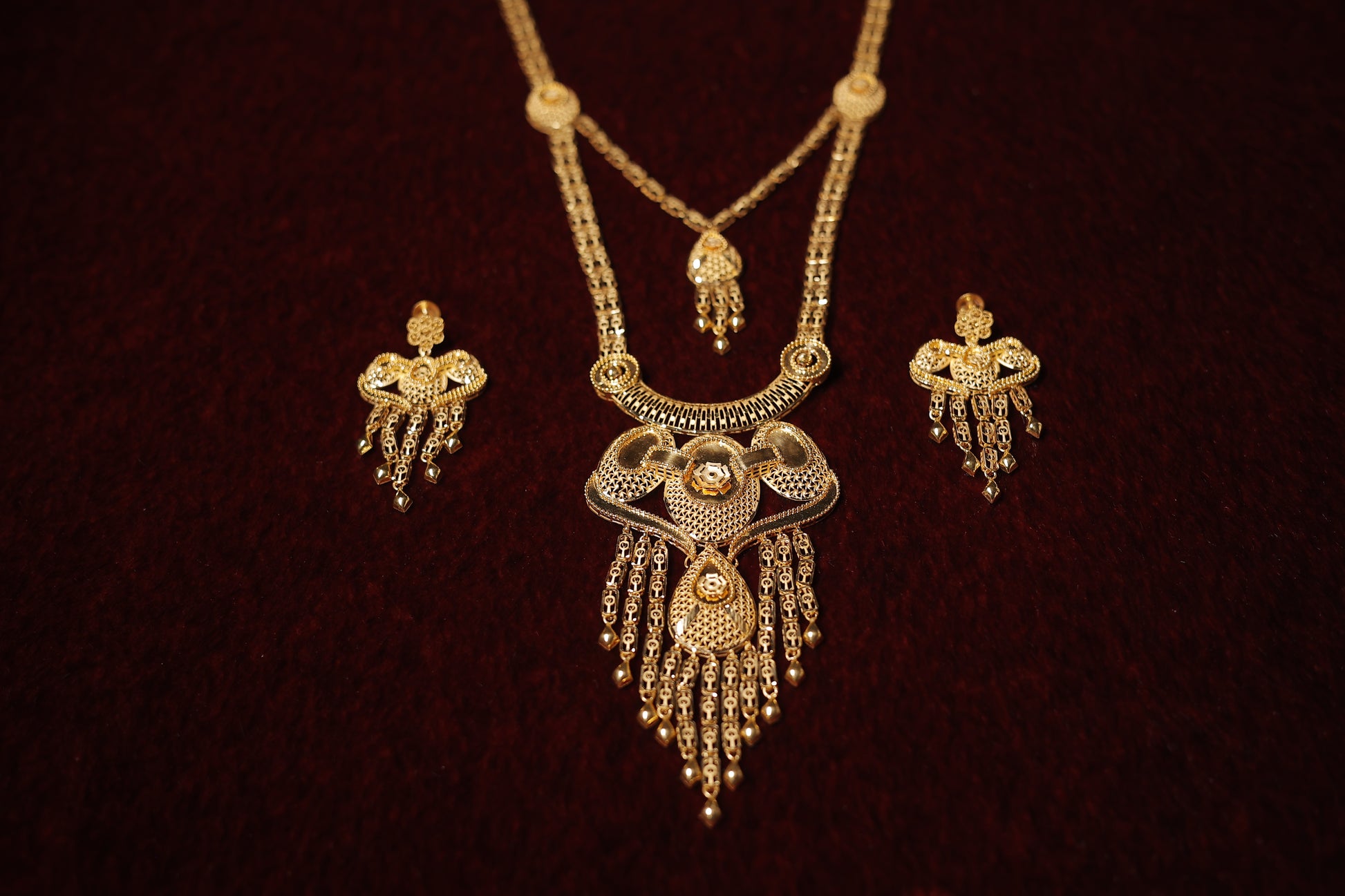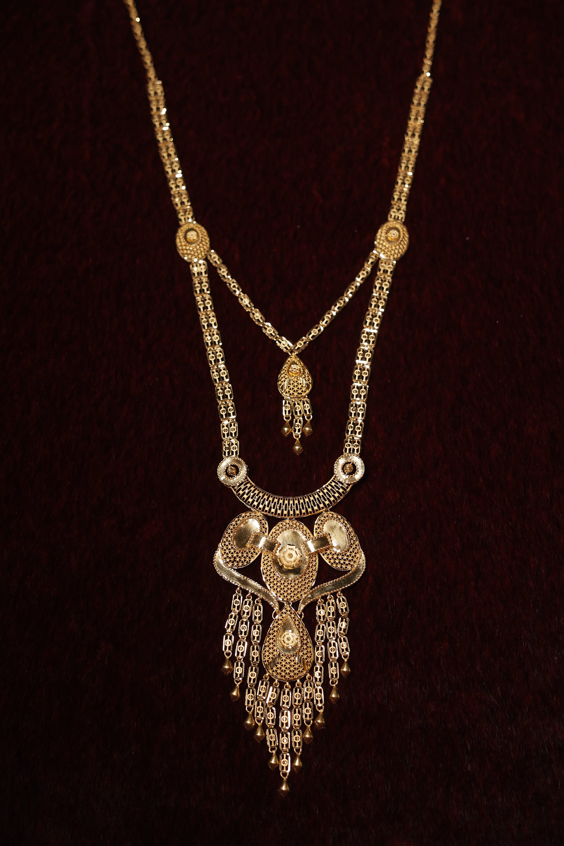This exquisite long gold necklace with matching earrings features intricate detailing and a luxurious gold polish. The statement pendant, adorned with delicate hangings, adds a touch of timeless elegance. Designed for grand occasions, this set perfectly captures the essence of tradition and refinement.