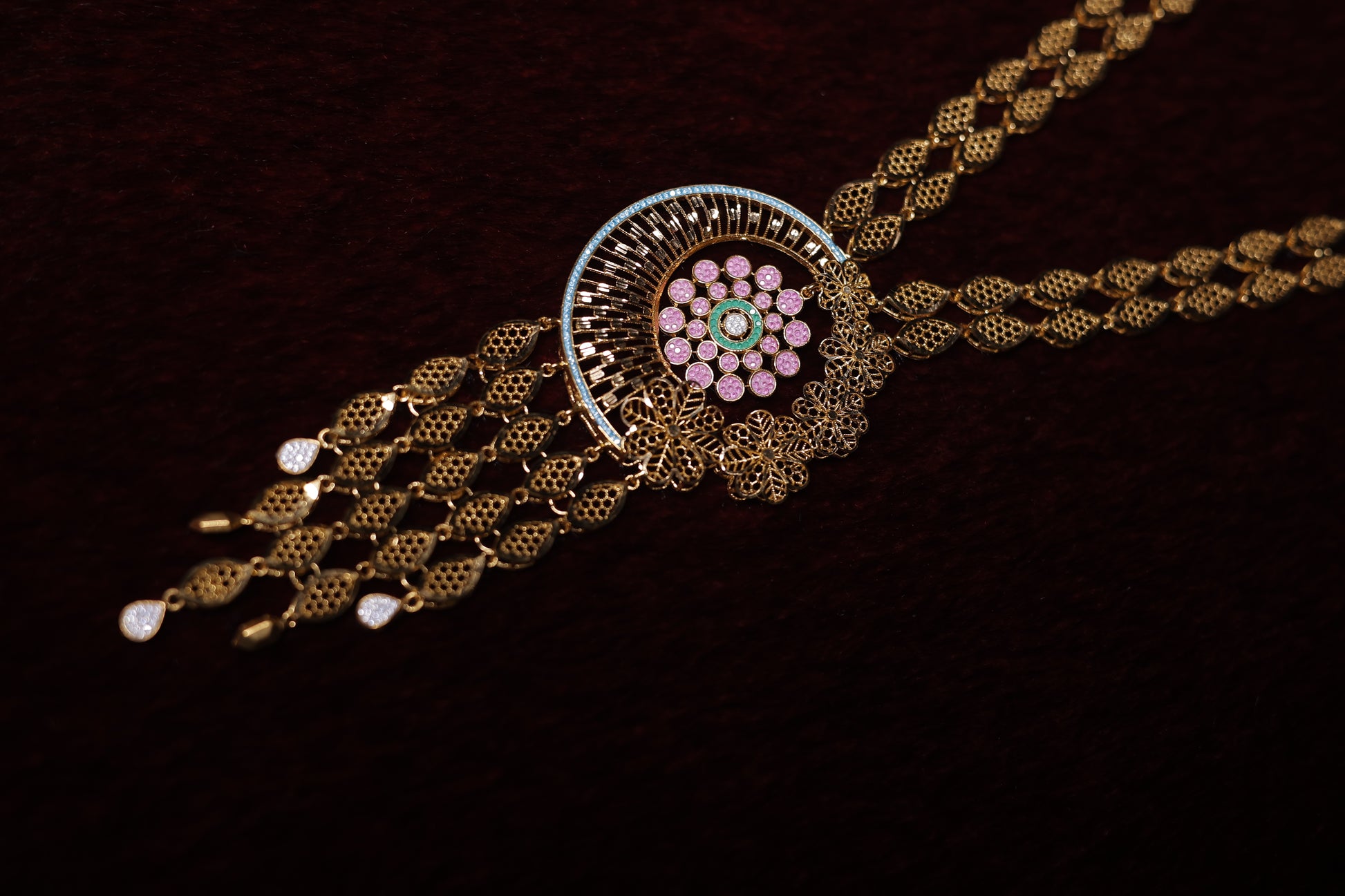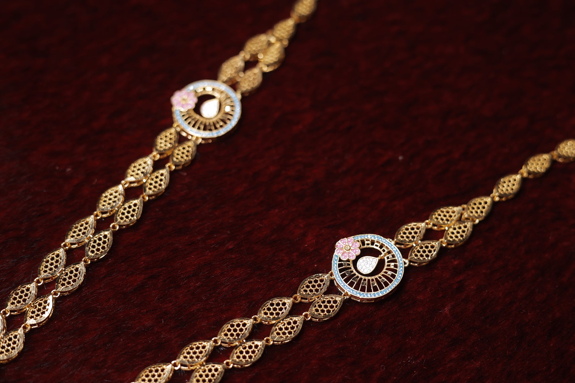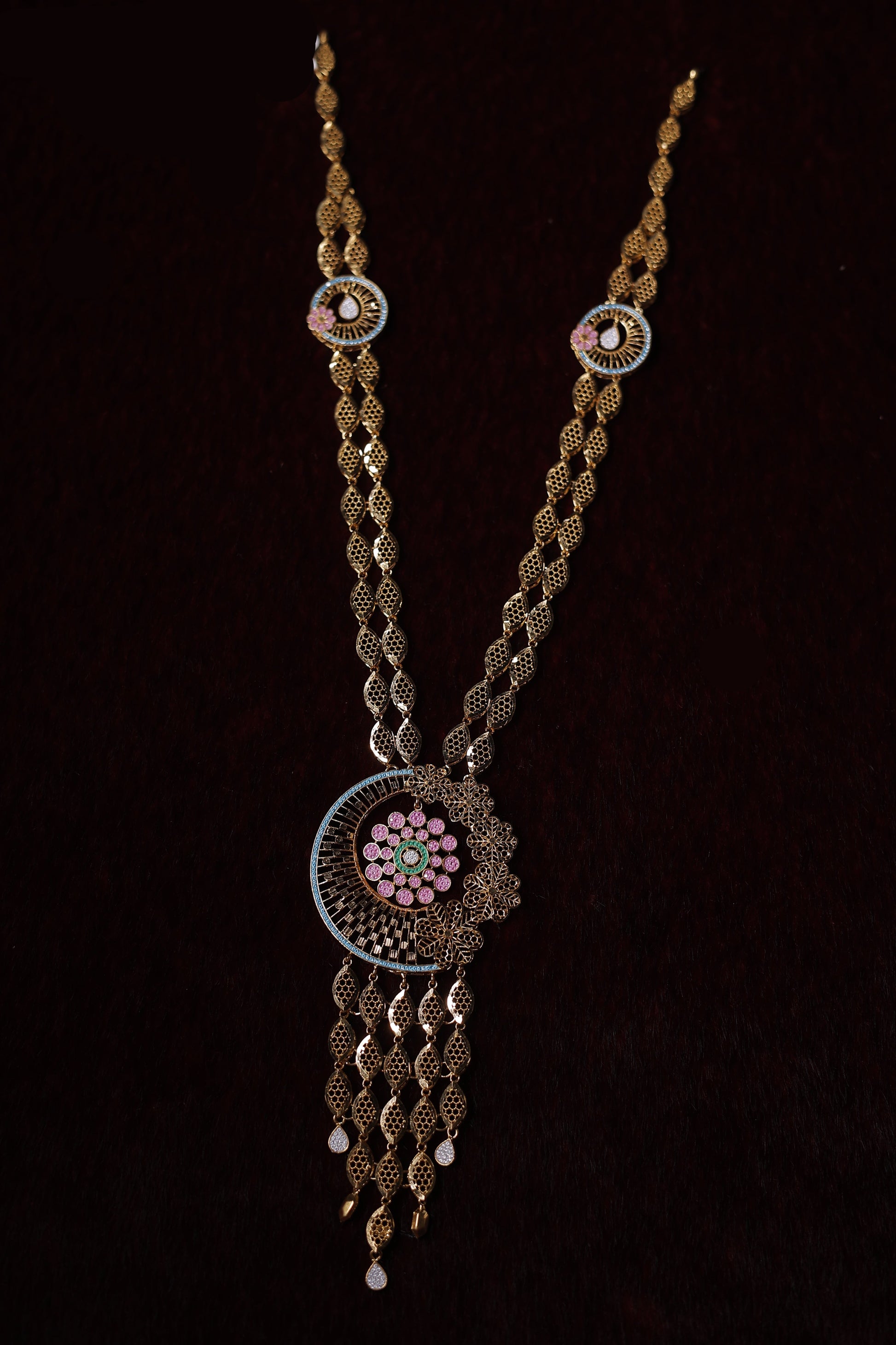 A masterpiece of elegance, this golden necklace features long, graceful gold hangings that add movement and charm. At its heart lies a radiant yellow flower-shaped pendant, beautifully accented with a deep green centre. A symbol of nature’s beauty and timeless grace, this piece is perfect for those who love intricate craftsmanship with a touch of vibrancy.